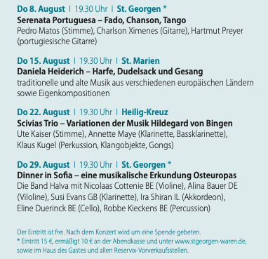 Bis Ende August finden die Sommerkonzerte jeden Donnerstag um 19.30 Uhr in einer der drei Warener Stadtkirchen statt: St. Marien ∙ St. Georgen ∙ Hl. Kreuz.