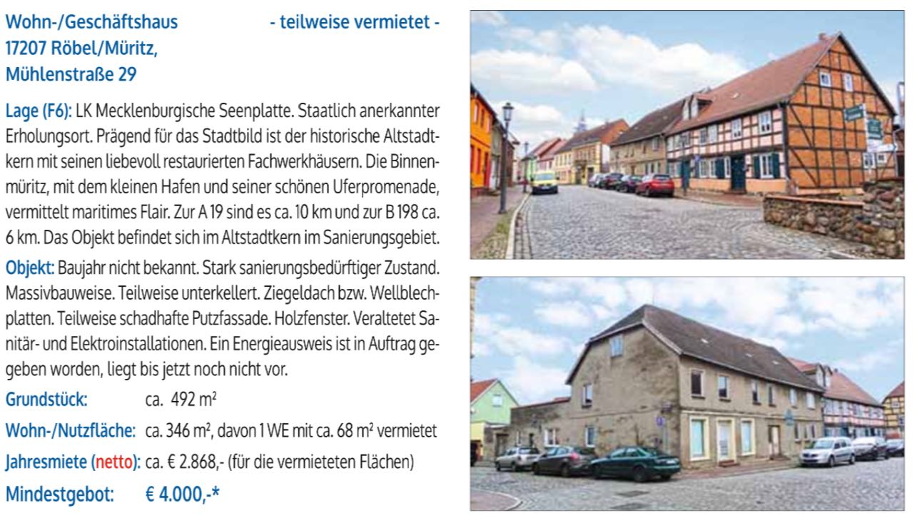spannendes Bieterrennen. Das Wohn- und Geschäftshaus in der Mühlenstraße 29 in Röbel hatte ein Mindestgebot von 4000 Euro, verkauft wurde es für 48 000 Euro,