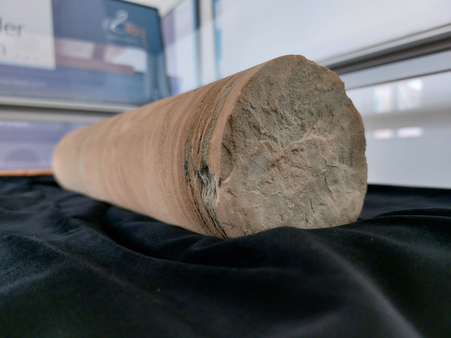Zu den geologischen Grundlagen „unserer“ Geothermie zeigt die Ausstellung ein beeindruckendes Exponat – einen Originalbohrkern von der ersten Bohrung auf dem Papenberg von 1981. Deutlich erkennbar sind die Sandschichten, die am Ende der Trias (vor ca. 206 – 201 Mio. Jahre) abgelagert wurden und aus denen später das warme salzhaltige Thermalwasser gefördert wurde.