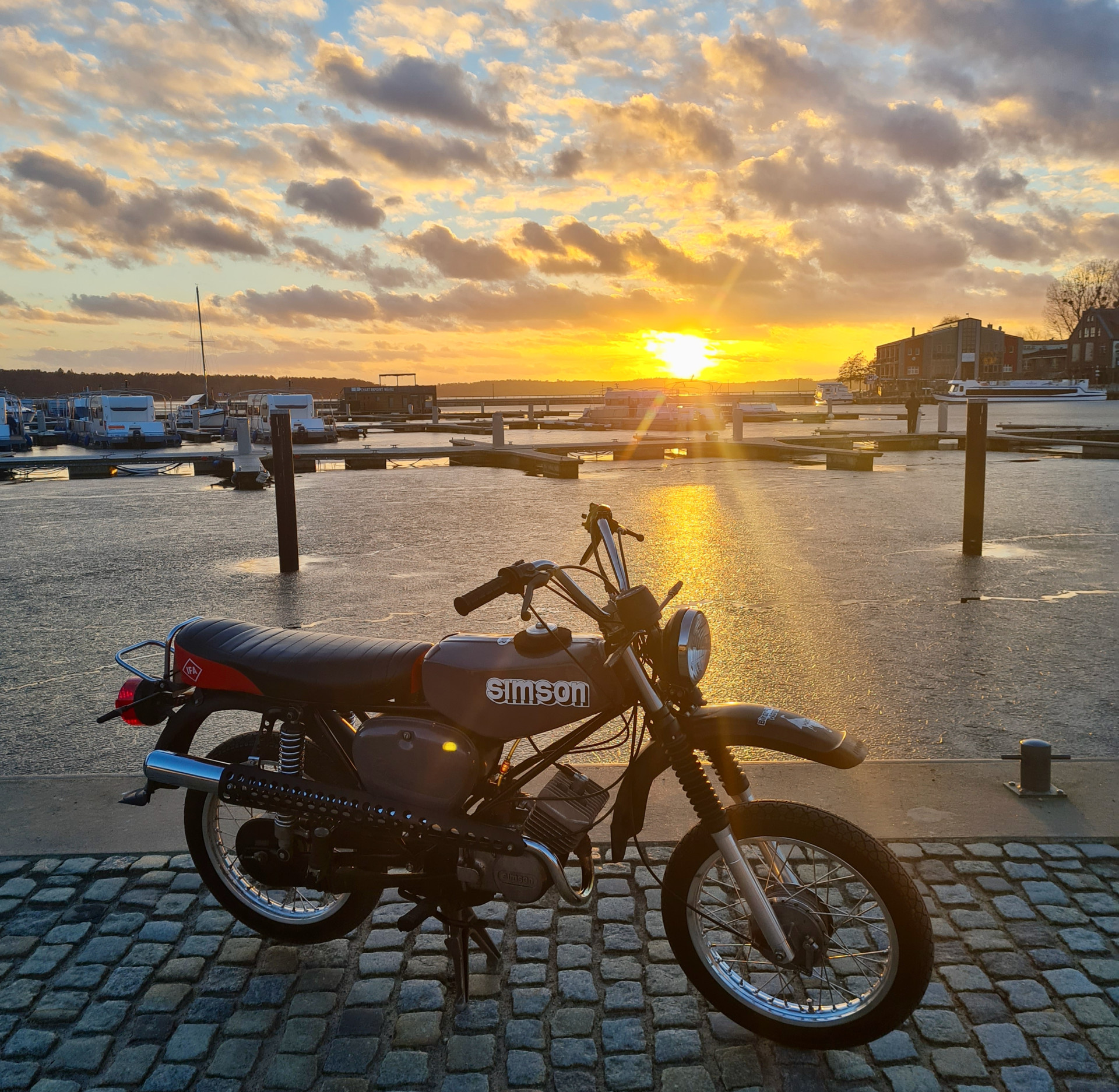 Sonnenuntergang während der Mopedtour: Der 19-jährige Christoph hat seine geliebte Simson S51 Enduro am Warener Hafen gleich mal in Szene gesetzt.