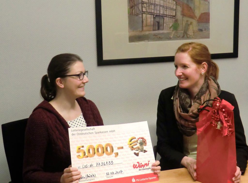 „Ich wollte doch nur sparen“ so der erstaunte Ausspruch der PS-Gewinnerin Marie Mischner, als ihre Kundenberaterin Nancy Wiegert ihr den symbolischen Scheck mit einer Gewinnsumme von 5.000 Euro überreichte. „Wofür der Gewinn verwendet werden soll, muss ich mir noch genau überlegen. Vielleicht nutze ich ihn für die Anschaffung eines neuen Autos,“ so Marie Mischner, als der erste Schreck verdaut war.