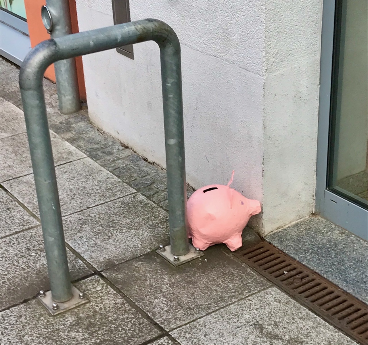 Wer macht denn bitte so was? Da „schließt“ jemand draußen vor dem Altstadtcenter in Waren sein Sparschwein an und vergisst das arme Ding dann.