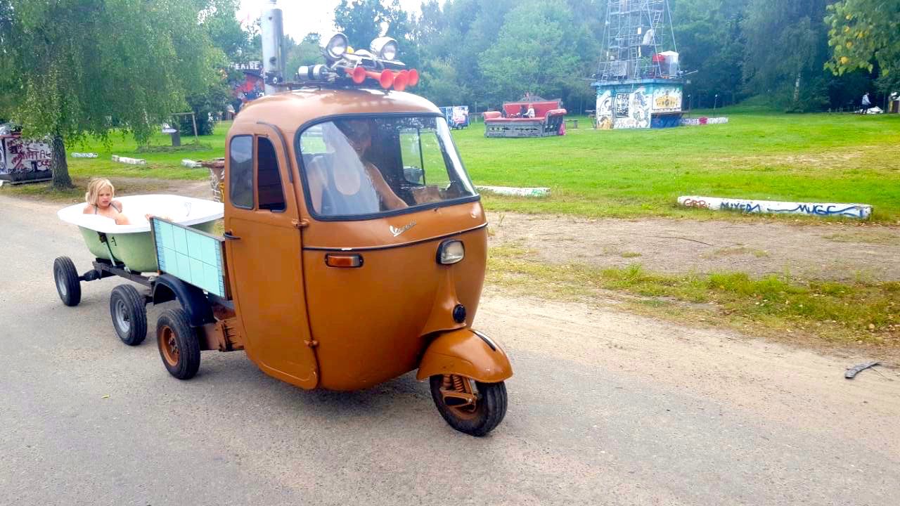 Beim „at.tension Festival“ in Lärz, das seit gestern und noch bis Sonntag läuft, gibt es viel zu sehen und vor allem zu staunen, wie beispielsweise dieses Gefährt. Das „at.tension Festival“ findet alle zwei Jahre statt und greift aktuelle Strömungen in der internationalen, zeitgenössischen Theaterkunst auf.