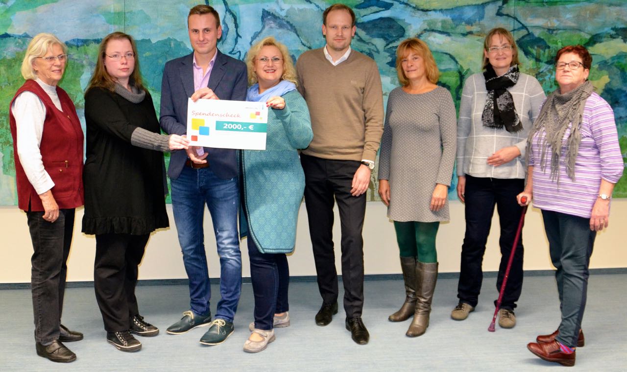 Foto: Philipp Schlösser (4.v.r.) und Thomas Sternberg (6.v.r.) übergeben den Spendencheck an Ramona Hempel (5.v.r.) und Mitglieder der Selbsthilfegruppe der DMSG