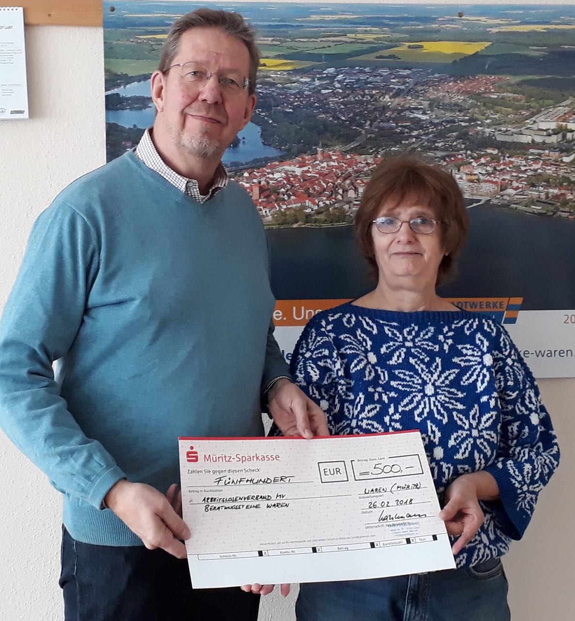 Der Seniorenbeirat der Stadt Waren hatte vorgeschlagen, den sich stark im sozialen Bereich engagierenden Verein in seinen Mühen zu unterstützen. So konnte Stefan Dahlmann von müritz.buch heute einen Scheck über 500 Euro an Kerstin Kordowski vom Arbeitslosenverband überreichen.