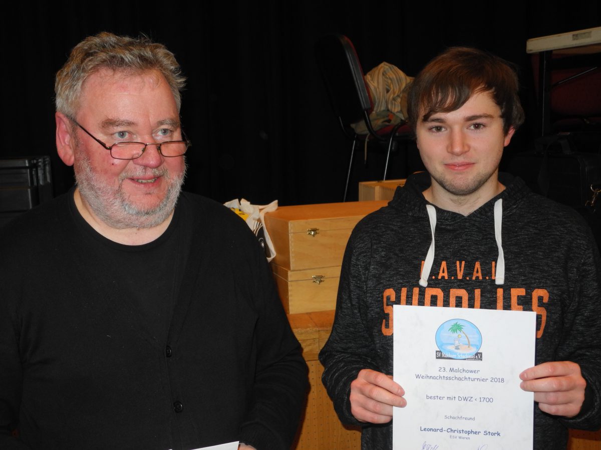 Diese konnten weitere schöne Erfolge bei den Sonderpreisen erzielen. Leo Stork (Foto links) spielte ein sehr starkes Turnier und war mit Platz 9 bester Spieler mit einer Wertungszahl unter 1700, Arne Quiram auf Platz 23 war der beste Spieler mit einer Zahl unter 1500 Punkten. Johannes Kruse auf Platz 16 erhielt den Preis als bester Jugendlicher.