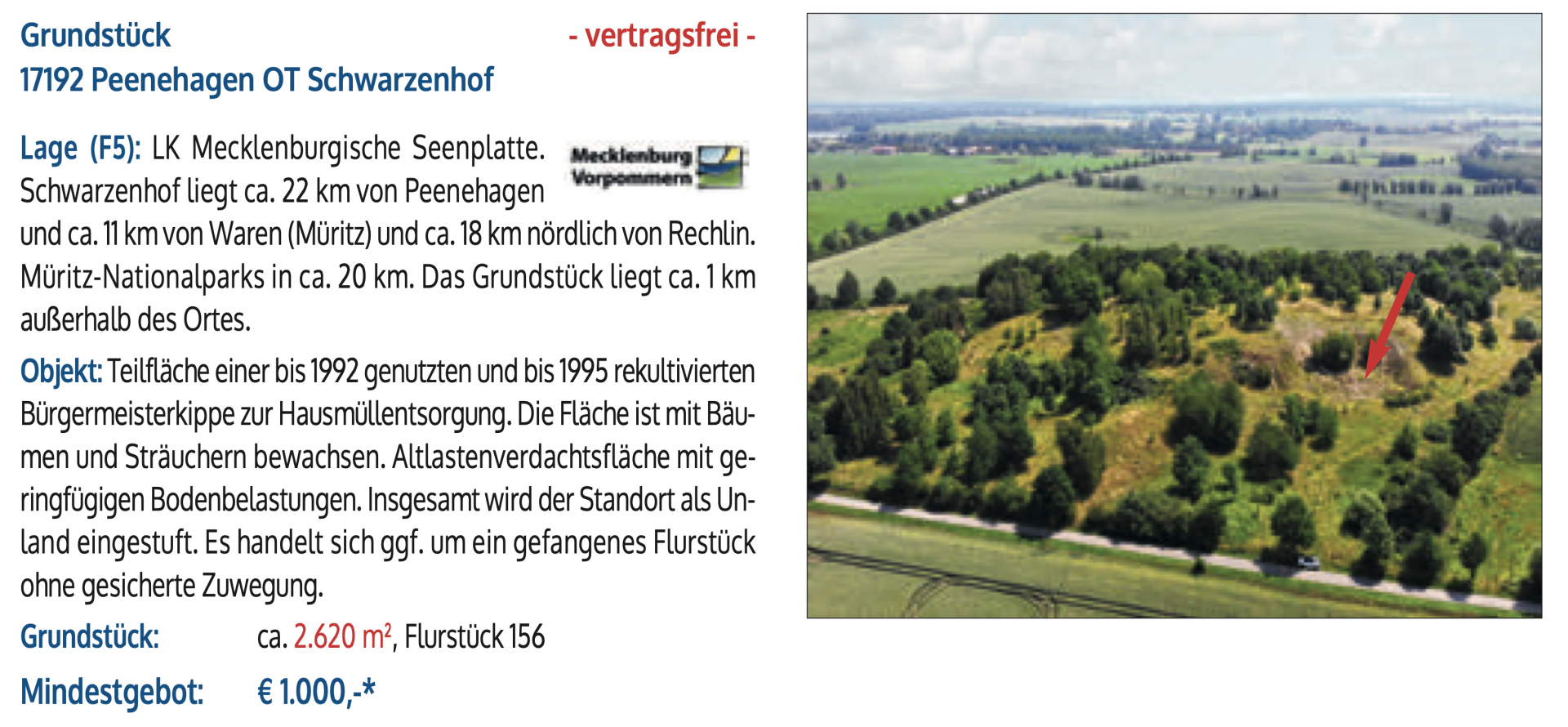 Die Erfahrung zeigt: Investoren scheuen sich inzwischen auch nicht mehr, rekultivierte Altdeponien für die Solarenergiegewinnung zu nutzen. Dafür könnten sogenannte „Bürgermeisterkippen“ in Schwarzenhof bei Peenehagen nördlich von Waren und Groß Varchow bei Möllenhagen in Frage kommen. Sie sind 2600 und 3600 Quadratmeter groß, gelten als „Altlastenverdachtsfläche mit geringfügiger Bodenbelastung“ und sollen als „Unland“ für 1000 oder 2000 Euro über den Tisch gehen. Auch in Wokuhl-Dabelow bei Neustrelitz wird eine solche rekultivierte Deponie versteigert.