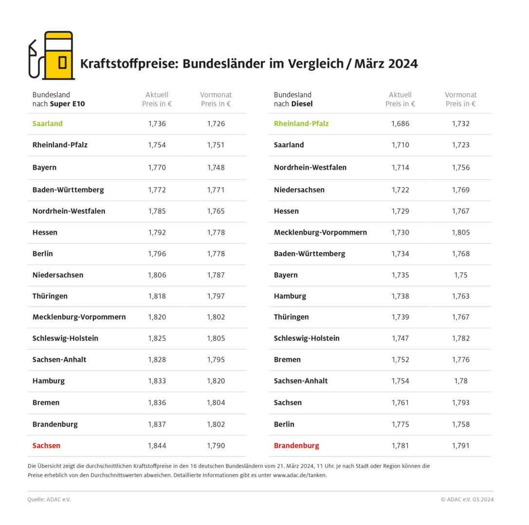 Für die heutige Untersuchung hat der ADAC die Preisdaten von mehr als 14.000 bei der Markttransparenzstelle für Kraftstoffe erfassten Tankstellen ausgewertet und den 16 Bundesländern zugeordnet. Die ermittelten Preise stellen eine Momentaufnahme vom 21. März, 11 Uhr, dar.