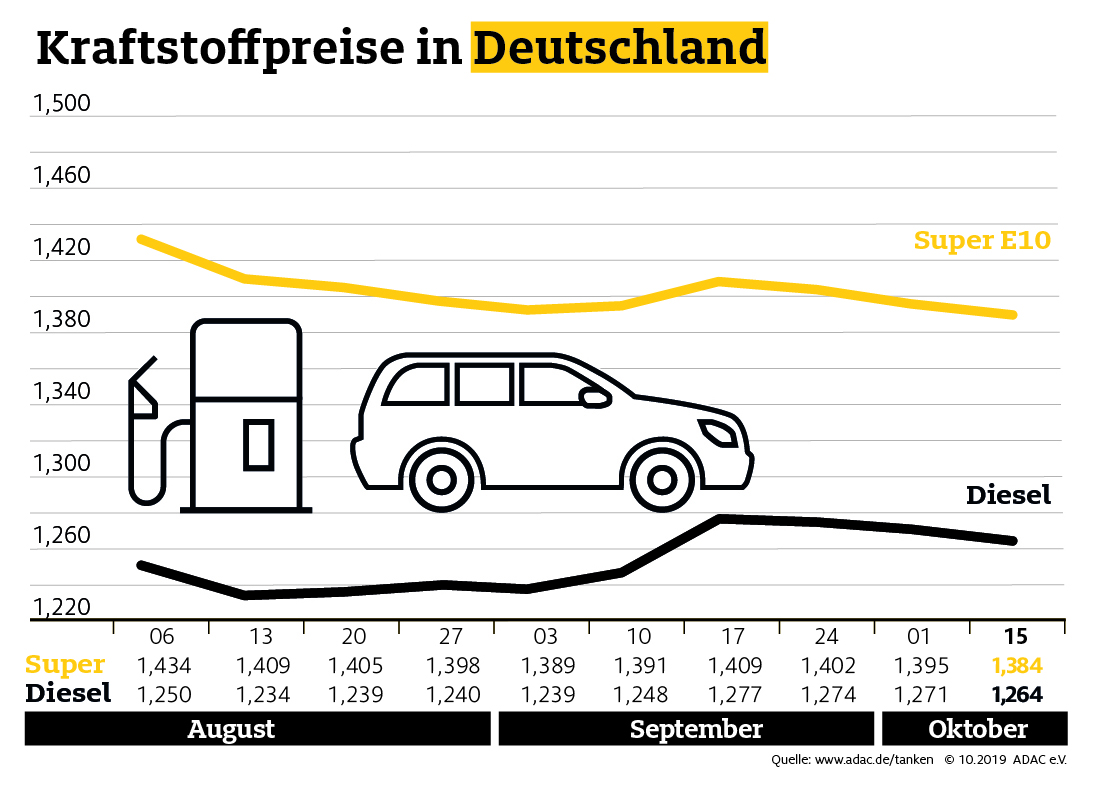Vor allem bei Super E10 ist der Rückgang mit 1,2 Cent pro Liter deutlich. Ein Liter kostet im bundesweiten Durchschnitt nun 1,384 Euro. Beim Diesel fällt der Preisrückgang mit 0,1 Cent pro Liter dagegen nur gering aus. Ein Liter liegt damit aktuell bei 1,264 Euro.