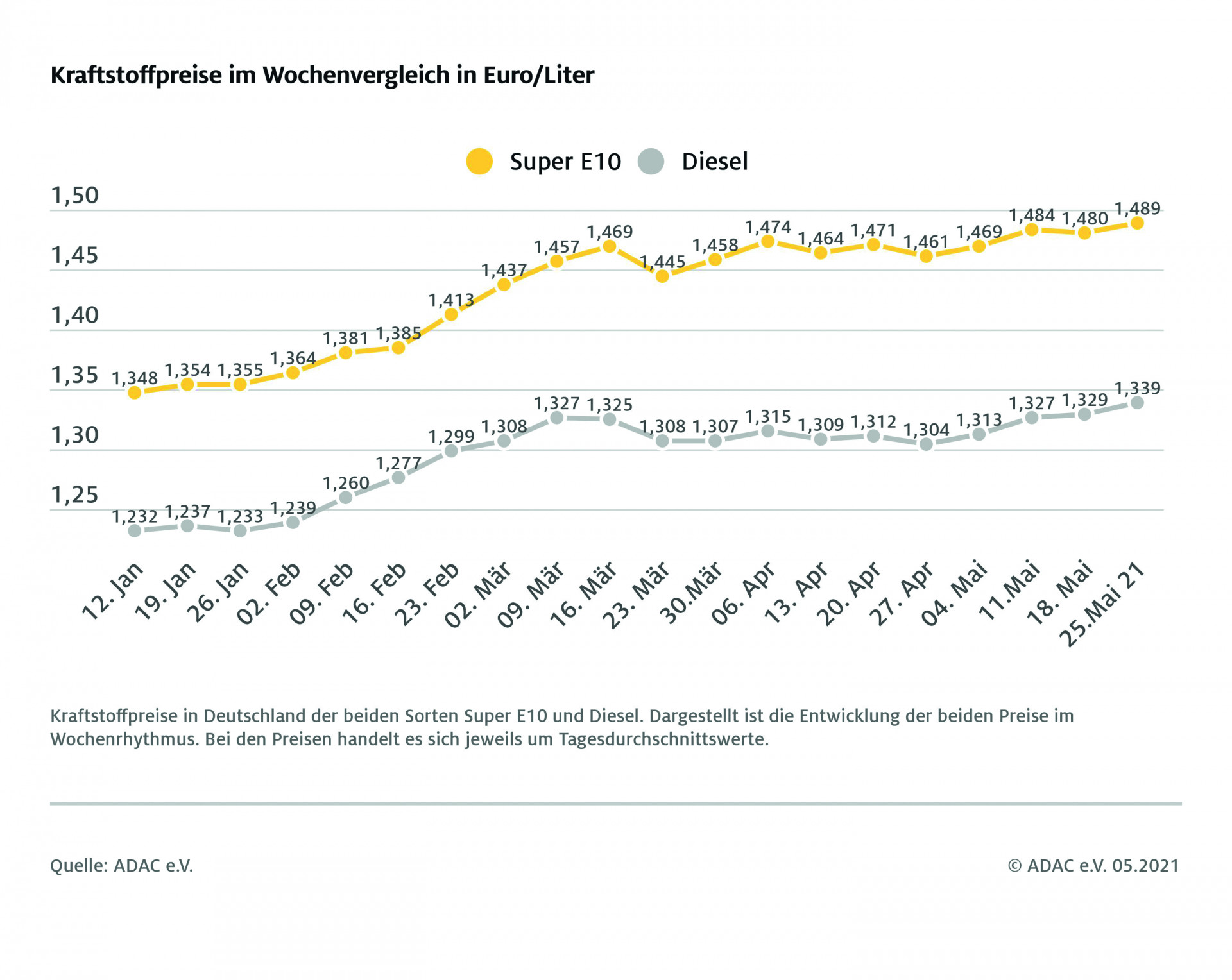 Maßgeblich beeinflusst wird die Entwicklung der Spritpreise an den Tankstellen durch den Rohölpreis. Ein Barrel der Sorte Brent notiert aktuell knapp unterhalb von 69 US-Dollar. Der Euro notiert im Bereich von 1,22 US-Dollar und zeigt sich im Wochenvergleich ebenfalls stabil.