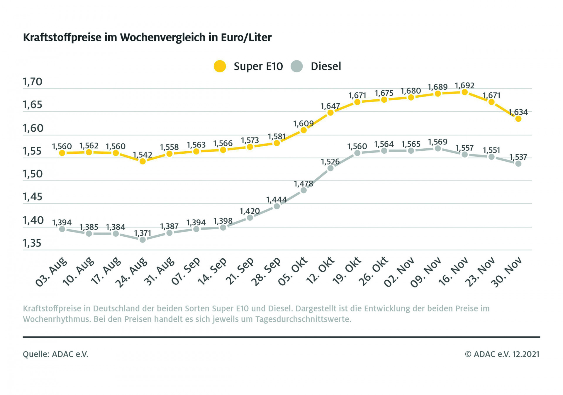 Diesel kostete im selben Vergleichszeitraum im November im Schnitt 1,560 Euro und somit im Monatsmittel 2,7 Cent mehr als im Oktober. Damit erreichten beide Sorten im Mittelwert über einen ganzen Monat auch ein neues Allzeithoch. Bereits im Oktober waren neue Höchststände erreicht worden.