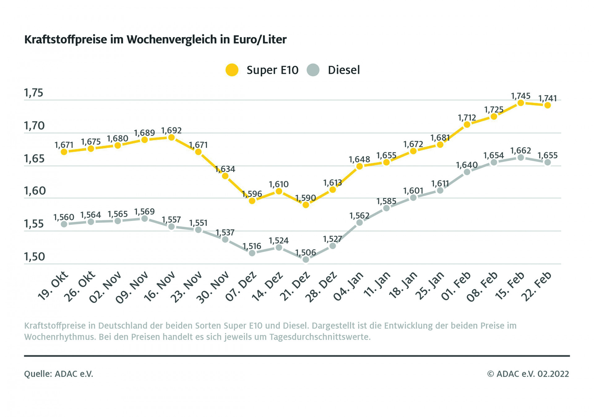 Erstmals seit zwei Monaten sind die Kraftstoffpreise in Deutschland im Wochenvergleich leicht gesunken. Sie liegen aber weiterhin auf einem sehr hohen Niveau. Ein Liter Super E10 kostet laut aktueller ADAC Auswertung im bundesweiten Mittel 1,741 Euro, das sind 0,4 Cent weniger als in der Vorwoche. Auch der Dieselpreis ging zurück. Ein Liter kostet laut ADAC im Durchschnitt 1,655 Euro – ein Minus von 0,7 Cent.