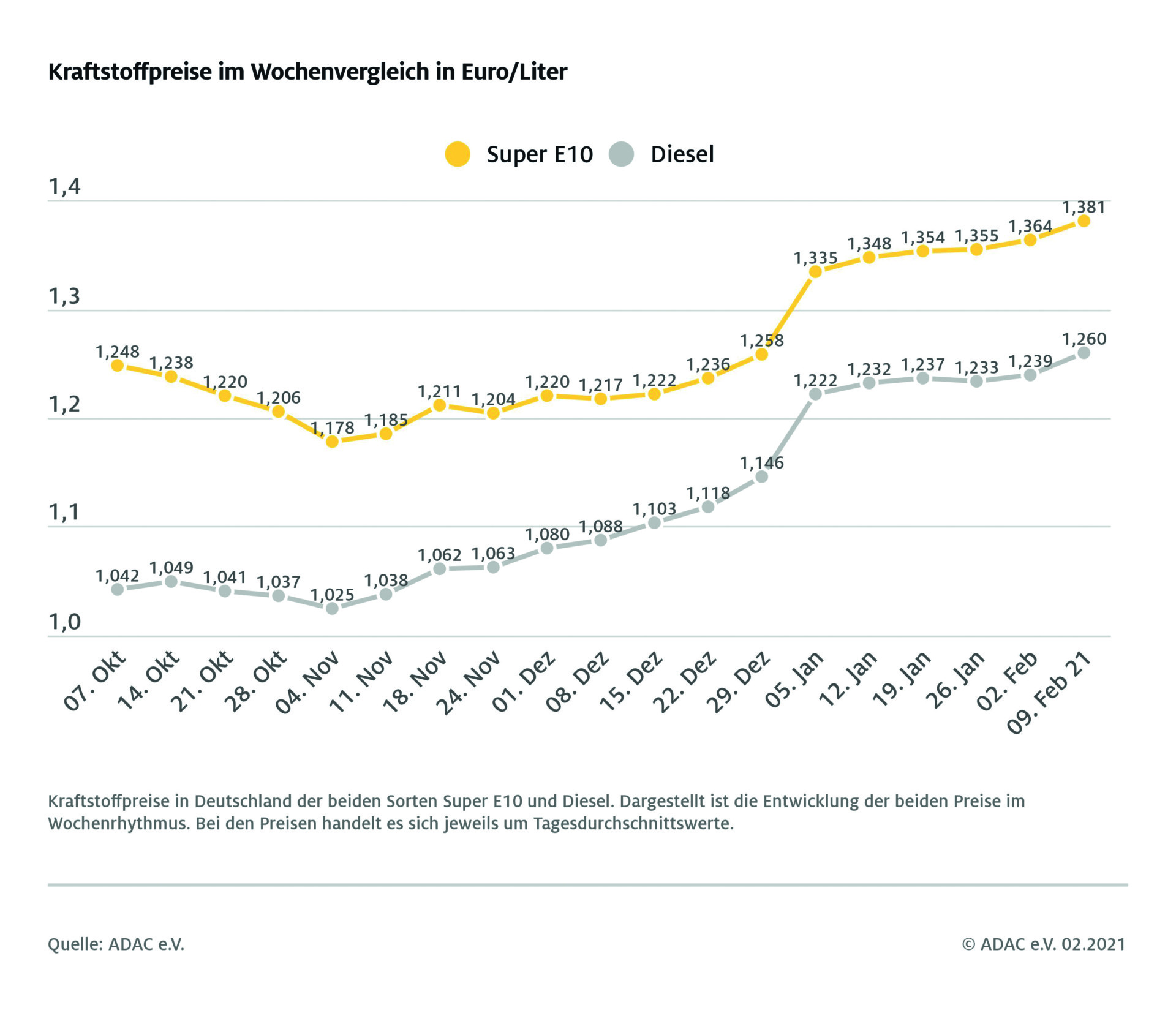 Benzin und Diesel sind in Deutschland binnen Wochenfrist deutlich teurer geworden. Wie die wöchentliche ADAC Auswertung der Kraftstoffpreise zeigt, verteuerte sich vor allem Diesel. So kostet ein Liter aktuell im bundesweiten Mittel 1,260 Euro, das sind 2,1 Cent mehr als in der Vorwoche. Der Preis für einen Liter Super E10 stieg um 1,7 Cent auf 1,381 Euro.