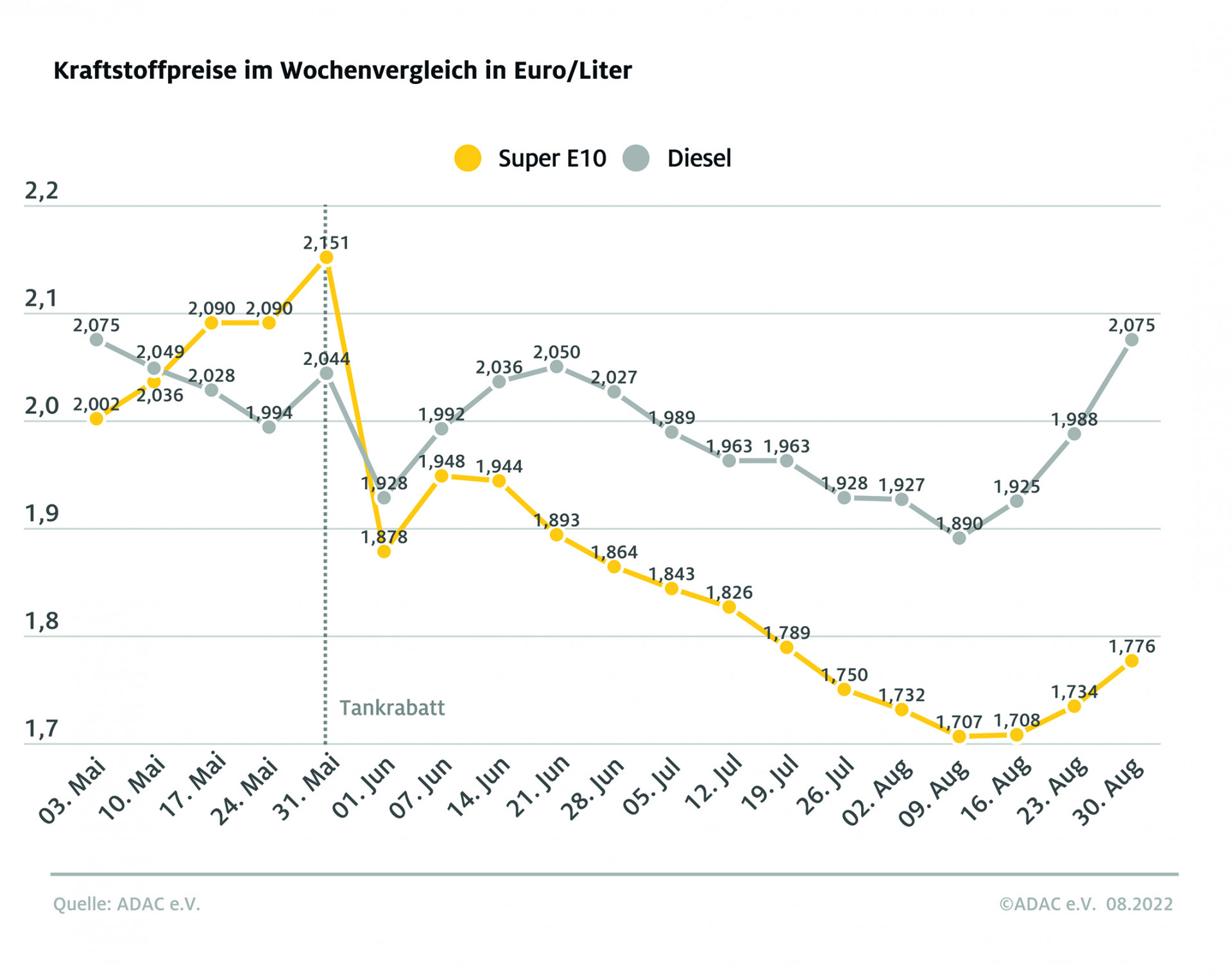 Bereits vor dem offiziellen Ende des Tankrabatts ziehen die Kraftstoffpreise kräftig an. Das ermittelt der ADAC in seiner wöchentlichen Auswertung der Spritpreise. Ein Liter Super E10 kostet derzeit im bundesweiten Mittel 1,776 Euro. Im Vergleich zu Vorwoche entspricht das einem Anstieg von 4,2 Cent. Beim Diesel ist der Preissprung noch größer. Ein Liter kostet derzeit im Bundesschnitt 2,075 Euro – 8,7 Cent mehr als noch vor einer Woche.