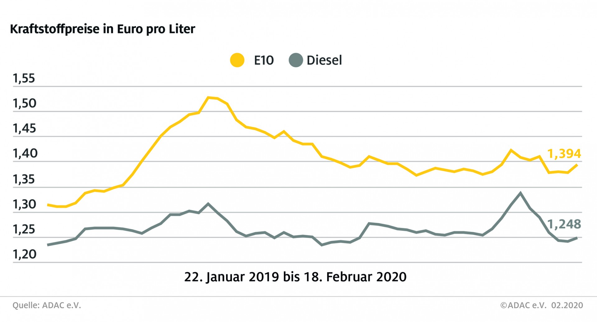 Gründe für den Anstieg sind der schwache Euro und die Entwicklung am Rohölmarkt. Während der Euro mit Kursen von rund 1,08 Dollar auf den niedrigsten Stand seit fast drei Jahren fiel, wurde Rohöl wieder teurer. Ein Barrel der Sorte Brent notiert derzeit bei rund 57 Dollar, das sind fast drei Dollar mehr als in der Vorwoche. Allerdings kostete das Barrel Rohöl Anfang Januar 2020 noch rund 69 Dollar. Dieser Rückgang ist bei den Tankkunden weiterhin nicht vollständig angekommen.