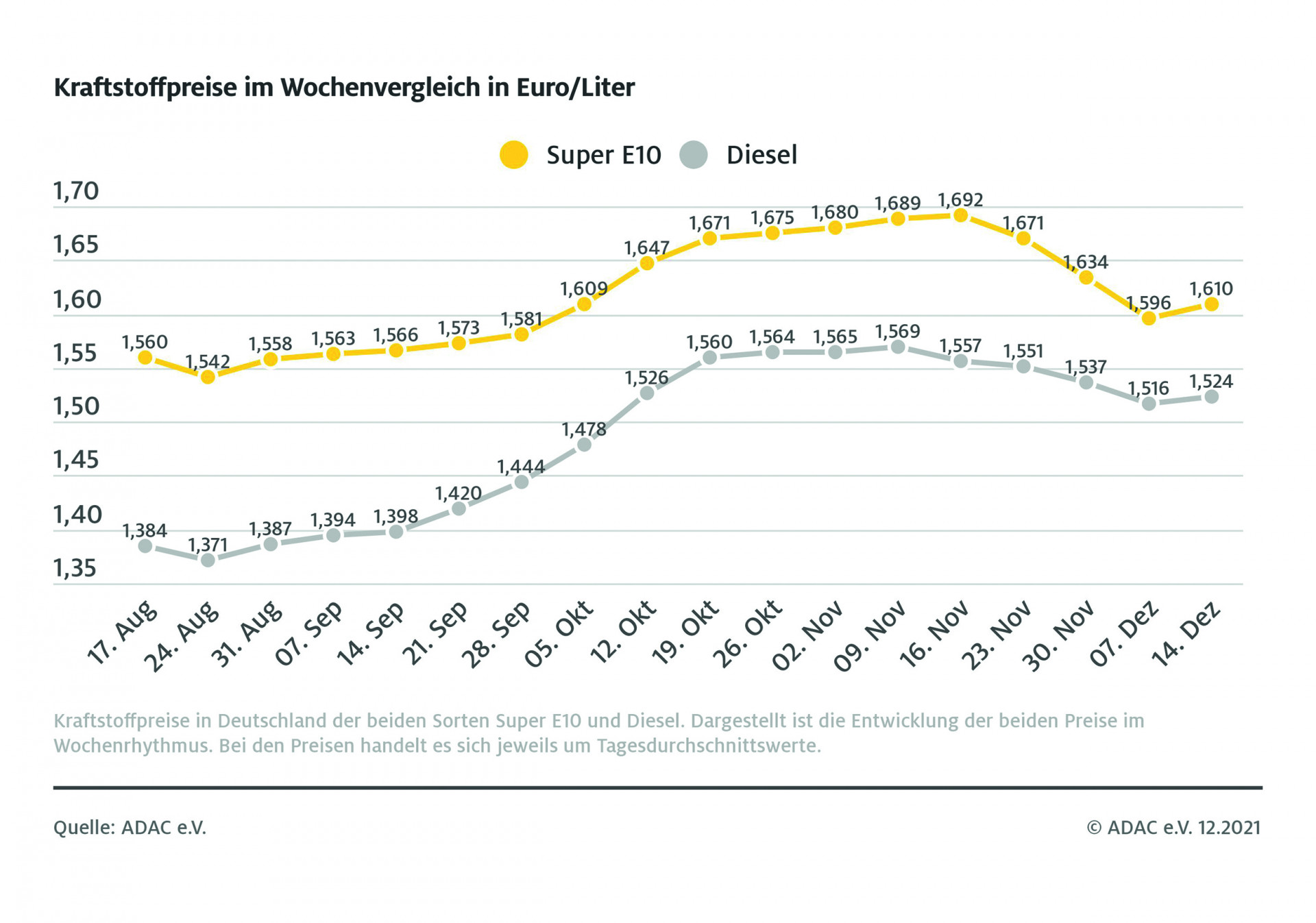 Der Benzinpreis hat nach einem dreiwöchigen Abwärtstrend wieder spürbar angezogen. Laut aktueller ADAC Auswertung der Kraftstoffpreise kletterte der Preis für einen Liter Super E10 im Vergleich zur Vorwoche um 1,4 Cent auf durchschnittlich 1,610 Euro. Etwas schwächer fiel der Anstieg des Dieselpreises aus: Ein Liter kostet aktuell im bundesweiten Mittel 1,524 Euro und damit 0,8 Cent mehr als in der Vorwoche.