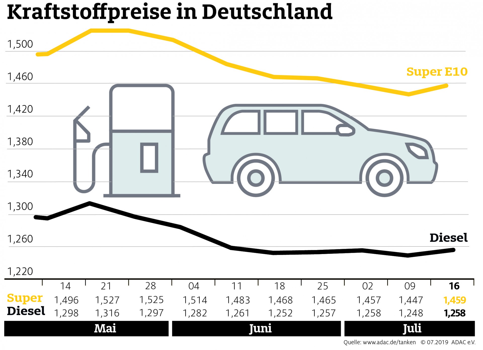 Nach Wochen fallender Benzin- und Dieselpreise wird Tanken wieder teurer. Laut aktueller Auswertung des ADAC kostet ein Liter Super E10 im Bundesdurchschnitt 1,459 Euro, das sind 1,2 Cent mehr als in der Vorwoche. Diesel verteuerte sich um 1,0 Cent auf 1,258 Euro je Liter.