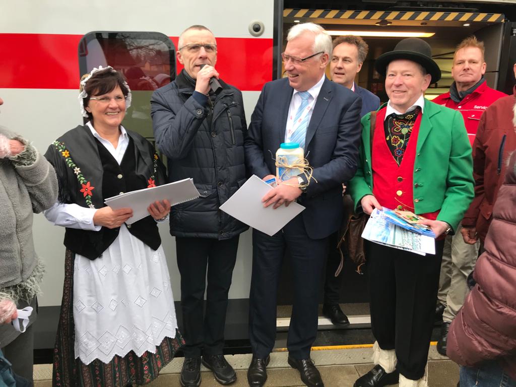 Auch Warens Bürgermeister und die Stadtführer Petra Hakert sowie Klaus Lambrecht haben den neuen IC in Waren begrüßt und ihm neben vielen guten Wünschen auch die eine oder andere Erinnerung an Waren mit auf den Weg gegeben.