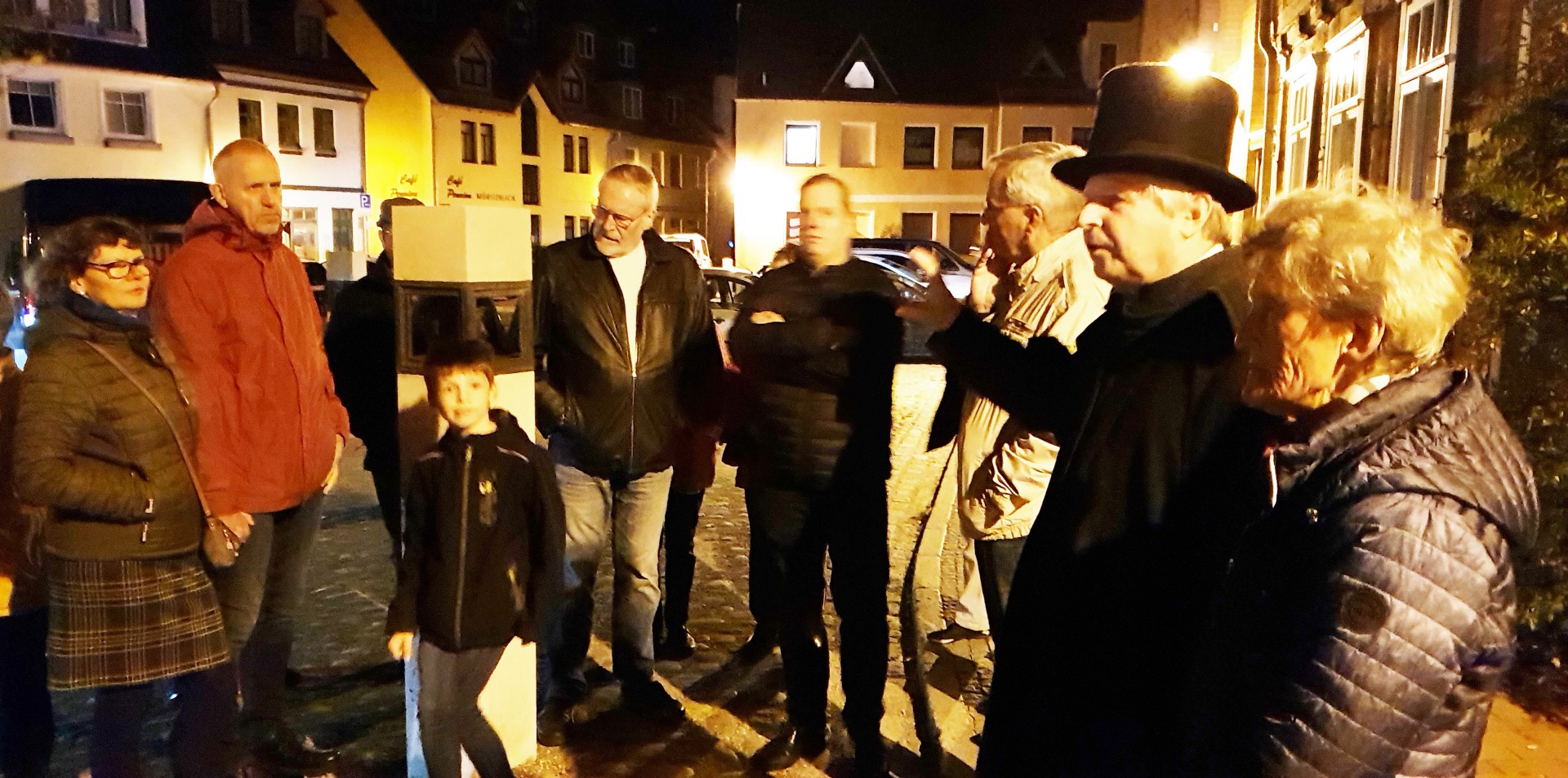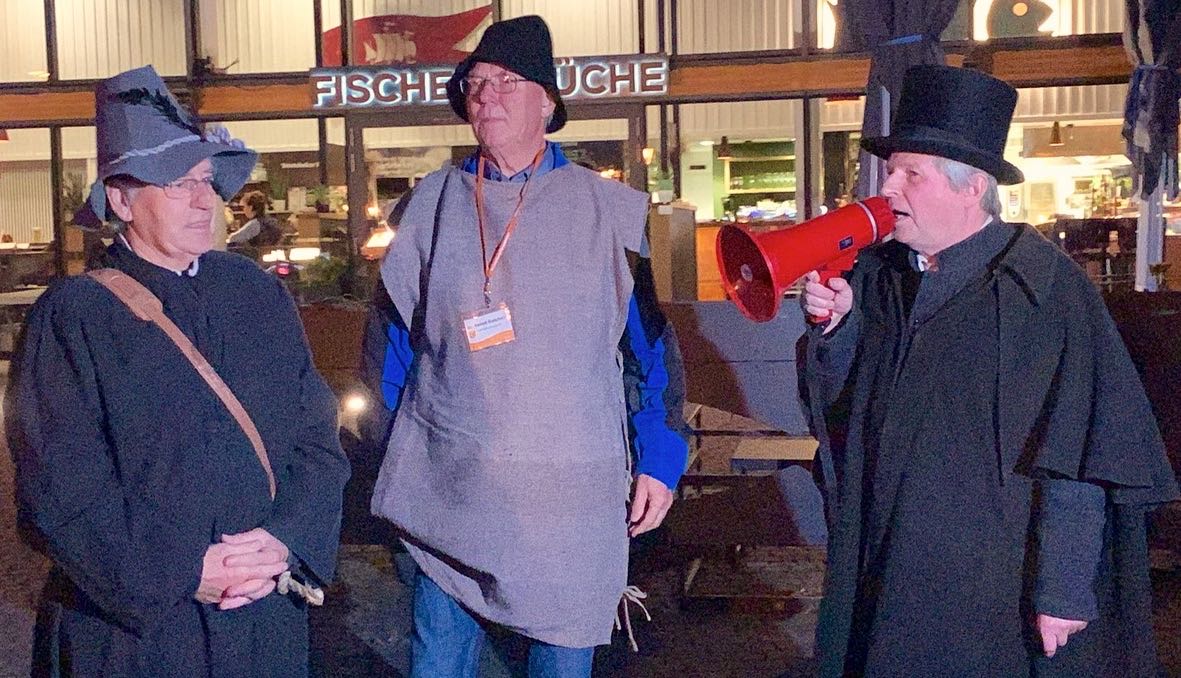 Jürgen Hass als Führer der größten Gruppe hatte sich mit Zylinder und schwarzer Robe kostümiert. Souverän und mit vielen Details aus der Warener Geschichte in seiner Rede lotste er die Spaziergänger oft über holpriges Kopfsteinpflaster. Zunächst zur Georgenkirche, dann durch die Richterstraße und die enge Gasse mit dem volkstümlichen Namen Morsritz zur Strandstraße und zum Hafen. Schließlich ging es durch die Hafenstraße zum Alten Markt und auf der Kirchenstraße zum Neuen Markt.