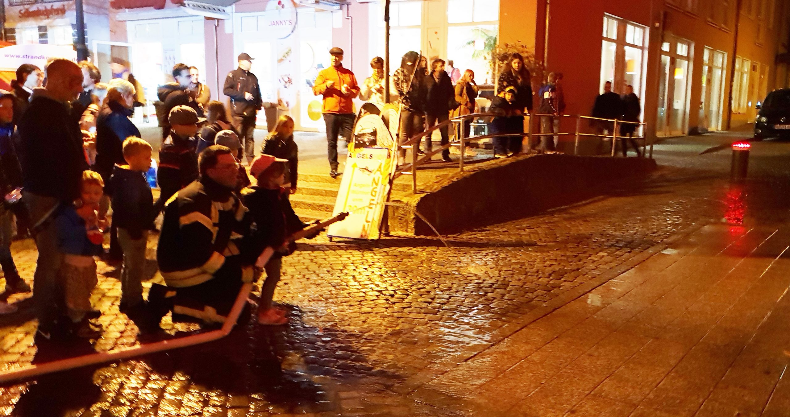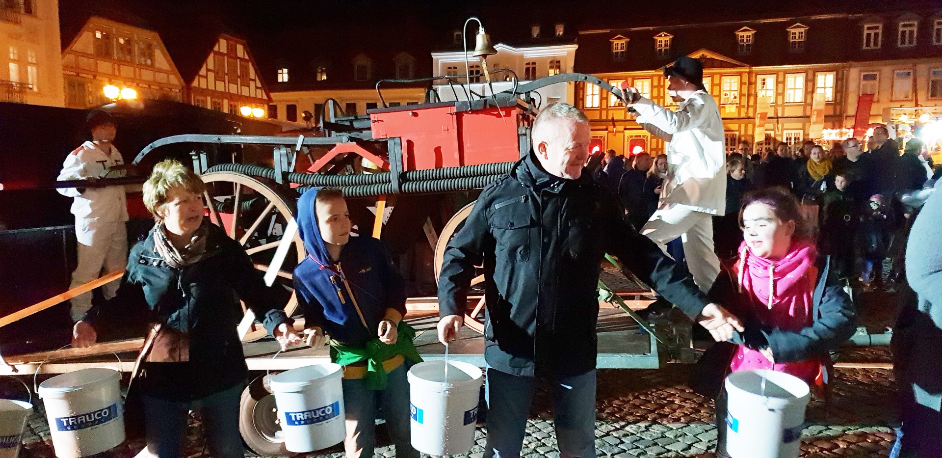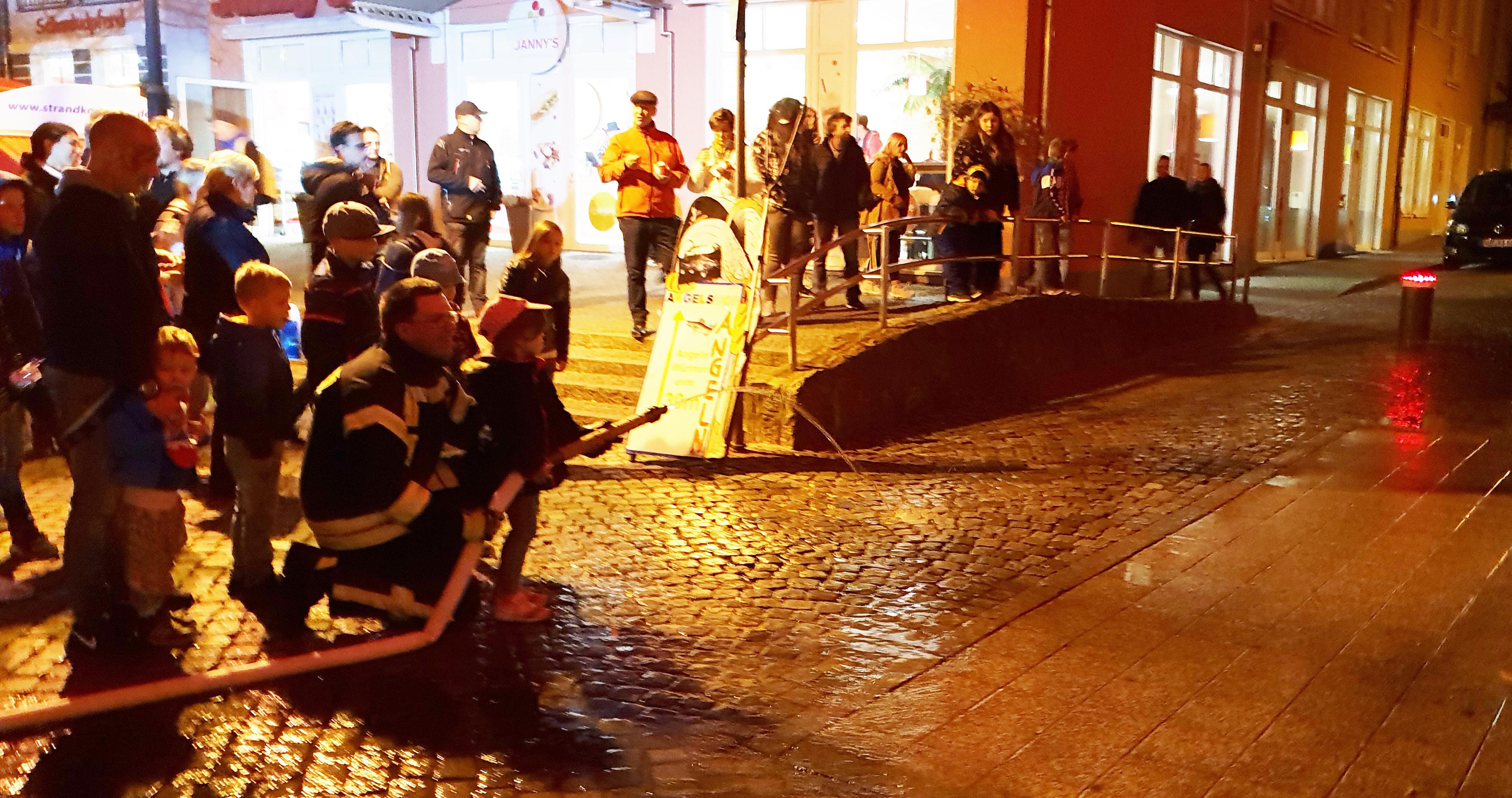 Parallel dazu betrieben Feuerwehrleute in weißer Schutzkleidung mit Muskelkraft eine Pumpe, die durch einen Schlauch Wasser zum Brandort strömen ließ. Nicht nur Erwachsene, sondern auch etliche Kinder waren mit Feuereifer bei der Aktion dabei und hatten Spaß. Als Geschenk für die Augen der Zuschauer hatte die Feuerwehr zudem die ehrwürdige Marienkirche mit rotem Scheinwerferlicht angestrahlt.