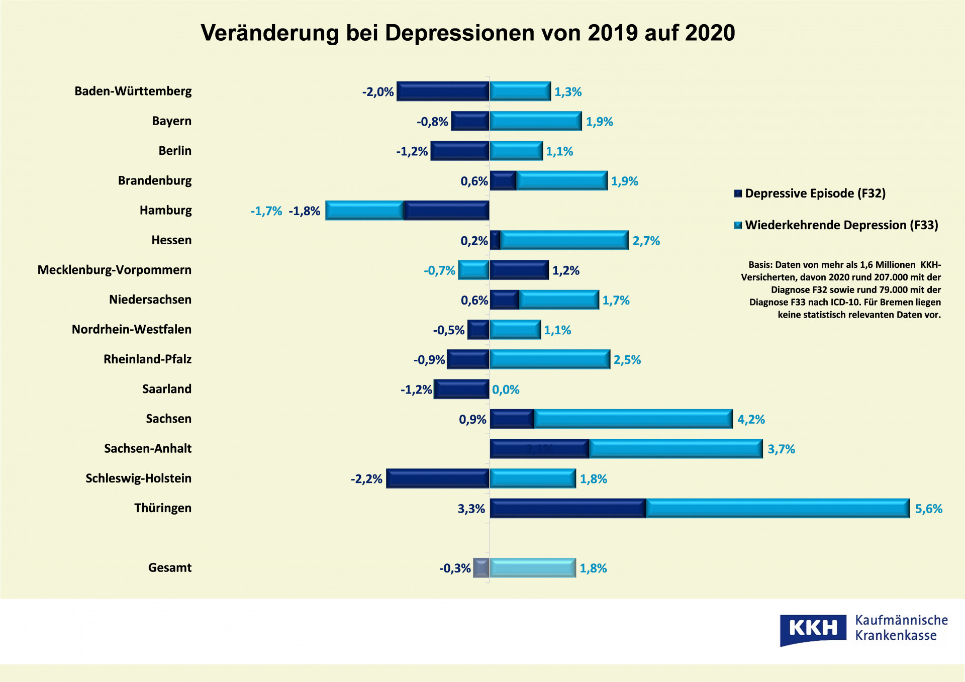 Vergleicht man das Jahr 2019 direkt vor der Pandemie mit dem vergangenen Jahr 2020, so registriert die KKH in Thüringen, Sachsen und Sachsen-Anhalt bei wiederkehrenden Depressionen bereits ein Plus von rund 6 beziehungsweise 4 Prozent. In Mecklenburg-Vorpommern und den übrigen Bundesländern sowie bei depressiven Episoden zeichnet sich hingegen noch kein nennenswerter Corona-Effekt ab. Noch sei es aber zu früh, diese Entwicklung abschließend zu bewerten, sagt Dr. Aileen Könitz, Ärztin und Expertin für psychiatrische Fragen bei der KKH.