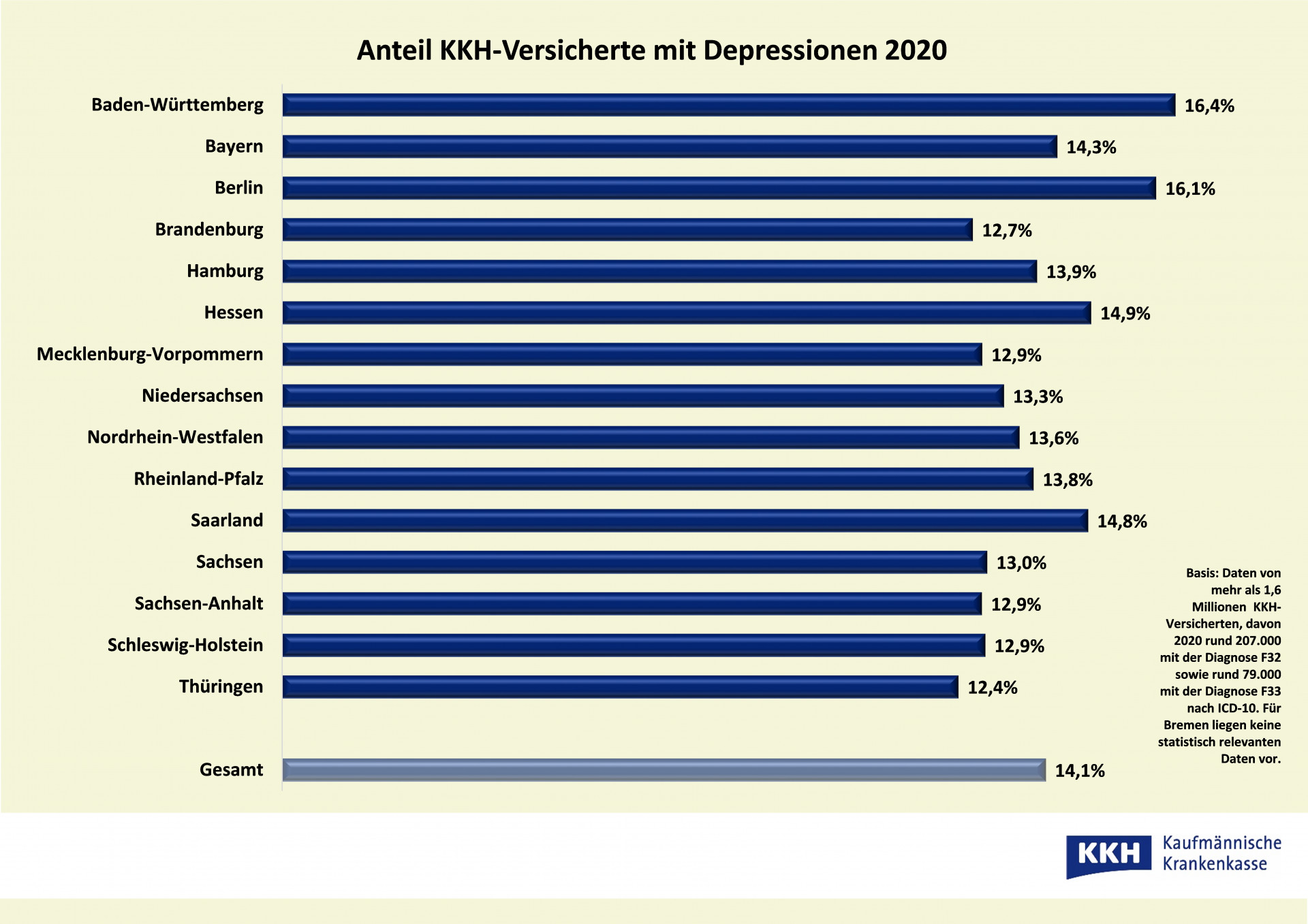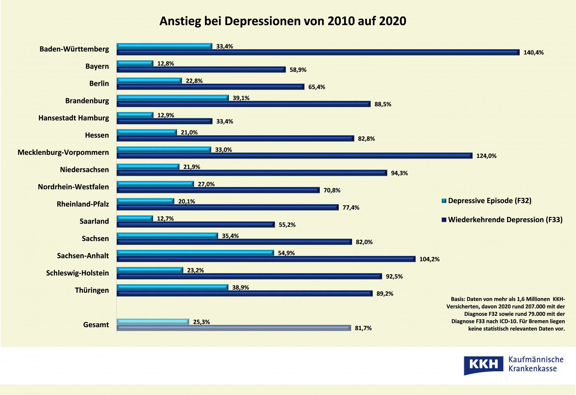 Vergleicht man das Jahr 2019 direkt vor der Pandemie mit dem vergangenen Jahr 2020, so registriert die KKH in Thüringen, Sachsen und Sachsen-Anhalt bei wiederkehrenden Depressionen bereits ein Plus von rund 6 beziehungsweise 4 Prozent. In Mecklenburg-Vorpommern und den übrigen Bundesländern sowie bei depressiven Episoden zeichnet sich hingegen noch kein nennenswerter Corona-Effekt ab. Noch sei es aber zu früh, diese Entwicklung abschließend zu bewerten, sagt Dr. Aileen Könitz, Ärztin und Expertin für psychiatrische Fragen bei der KKH.