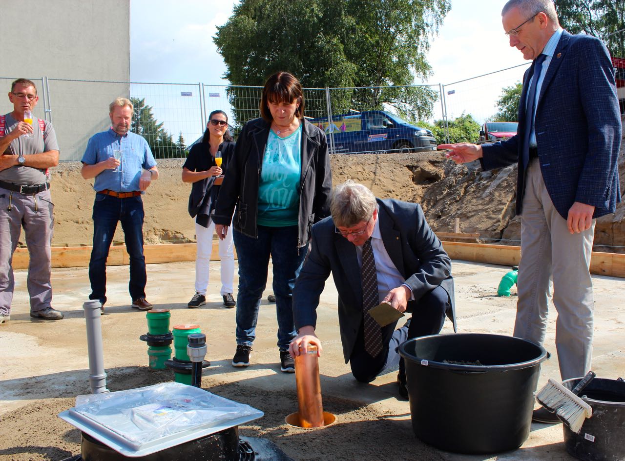 Mit der obligatorischen Grundsteinlegung haben WOGEWA-Chef Martin Wiechers und Warens Bürgermeister Norbert Möller heute den offiziellen Startschuss für den Bau von 28 neuen Wohnungen auf dem Nesselberg gegeben. Die Wohnungsbaugesellschaft baut damit nach über zehn Jahren erstmals wieder ein öffentlich gefördertes Haus und kann deshalb auch moderate Mieten anbieten.