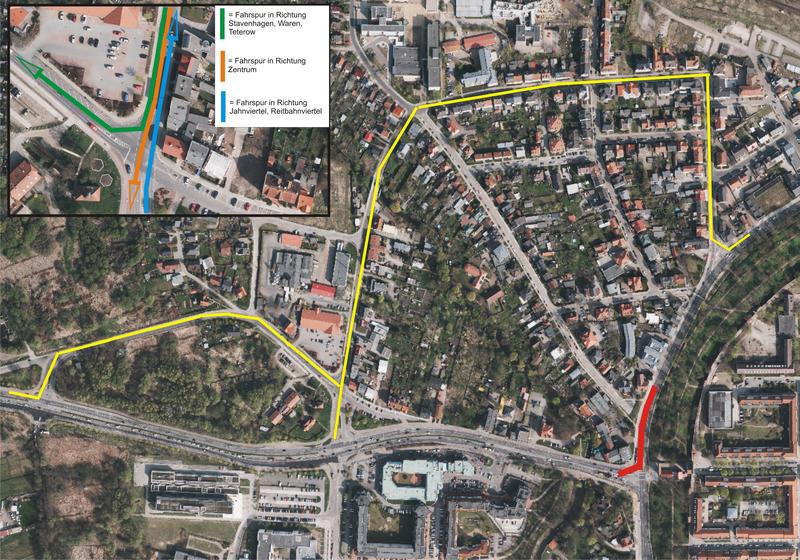 Kraftfahrer sollen dann schon eine Ausfahrt eher (Reuter-Straße, hinter Busbahnhof und den Gerichten) in das sogenannte Nachtjackenviertel mit den Villen fahren. Von dort führen zwei kleine Straßen (Robert-Blum- und Bachstraße) allerdings nur einspurig wieder an die Kreuzung an der Hochschule, wo man wieder nach rechts Richtung Waren und Stavenhagen abbiegen kann.