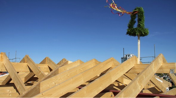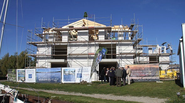 Grund zum Feiern im Hafendorf Müritz: Im Dachstuhl des ersten Gebäudes der Marina Müritz Apartments baumelt der Richtkranz. Direkt daneben wartet schon das zweite Gebäude auf den Dachstuhl und ein paar Meter weiter liegt der Grundstein für weitere zwei Gebäude. „Wenn alles nach Plan läuft“, so Mit-Bauherr Christian Langhoff, „stehen hier im Sommer 2019 vier Häuser mit zusammen 20 schönen Ferienapartments mit Blick auf Müritz und Classee.“