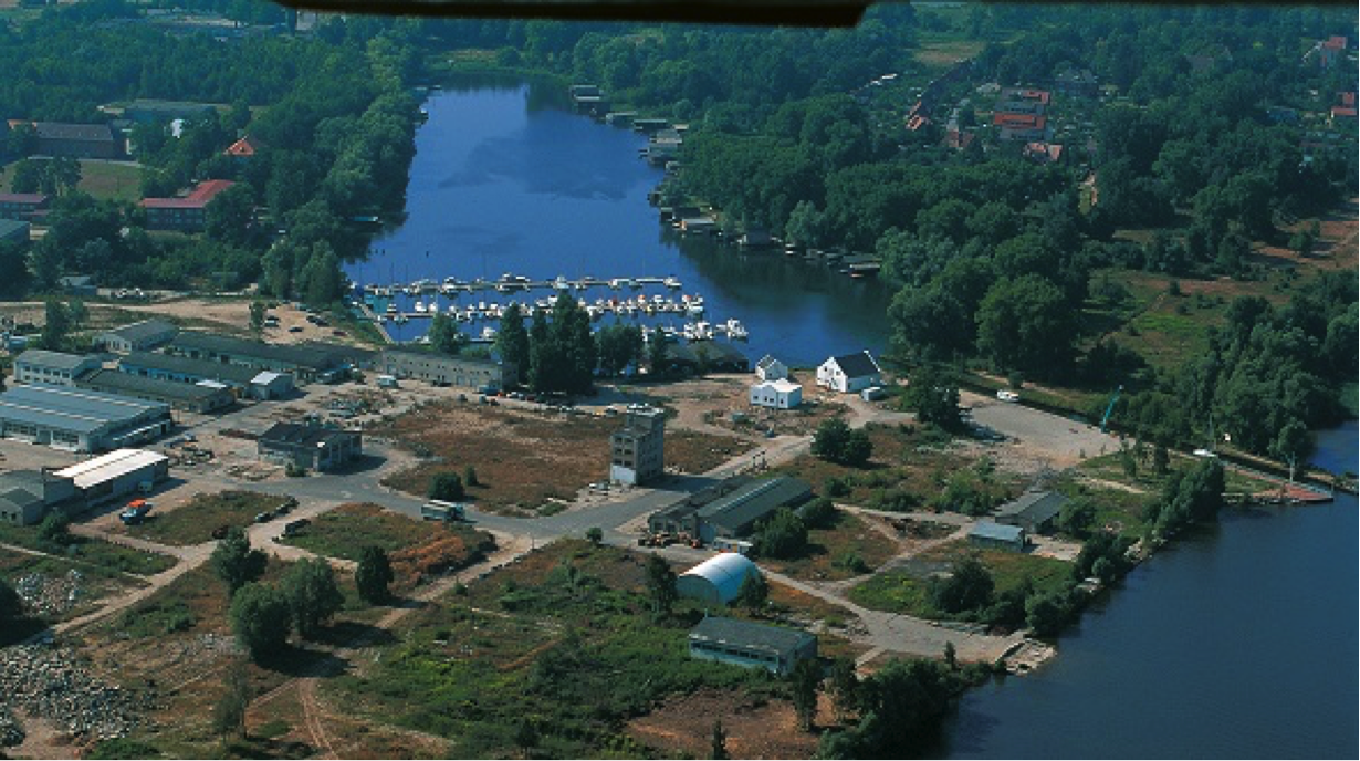 Foto unten: Das ehemalige Werftgelände des VEB Schiffswerft Rechlin (Luftbild von 1995)