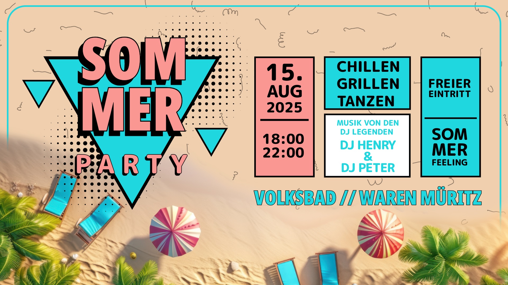 DJ Henry und DJ Peter, seit vielen Jahren in der Region aktiv, sorgen für den richtigen Sound. Am Grill gibt es Bratwürste und andere Leckereien, ein Eiswagen steht bereit, ebenso wie sommerliche Getränke – von fruchtig bis erfrischend. Unter dem Motto „Grillen. Chillen. Tanzen.“ soll der Abend ganz entspannt verlaufen. Mit der Premiere am Volksbad soll mitten in Waren ein Treffpunkt entstehen, Fortsetzung nicht ausgeschlossen.