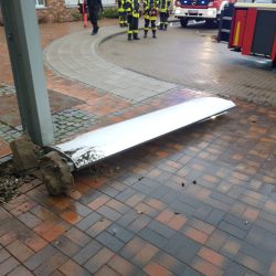 Wie kräftig der Sturm gerade durch die Müritz-Region gefegt ist, zeigen diese Bilder: Am Müritz-Klinikum auf dem Warener Weinberg hat es eine Werbestele samt Beton-Fundament umgehauen.