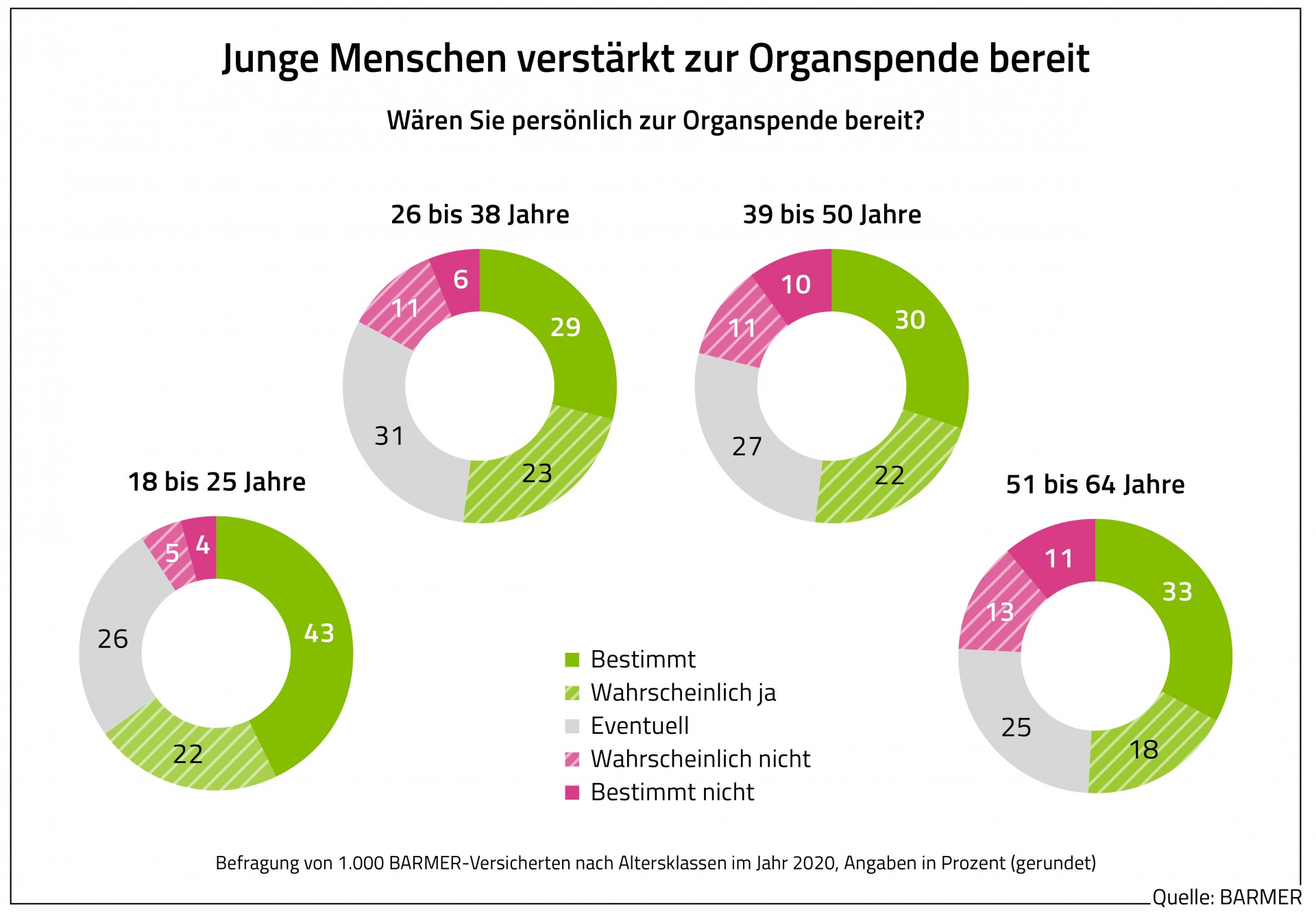Die Umfrage zeige, dass vor allem junge Menschen zwischen 18 und 25 Jahren mit 43 Prozent eine höhere Bereitschaft zur Organspende hätten. Zugleich sehe man vor allem bei den Älteren, dass der Organspende-Skandal nachwirke. So hätte unter den 16- bis 25-Jährigen jeder Fünfte bestätigt, dass durch den Skandal sein Vertrauen gesunken sei. Bei den Befragten zwischen 51 und 64 Jahren sei dieser Wert doppelt so hoch.