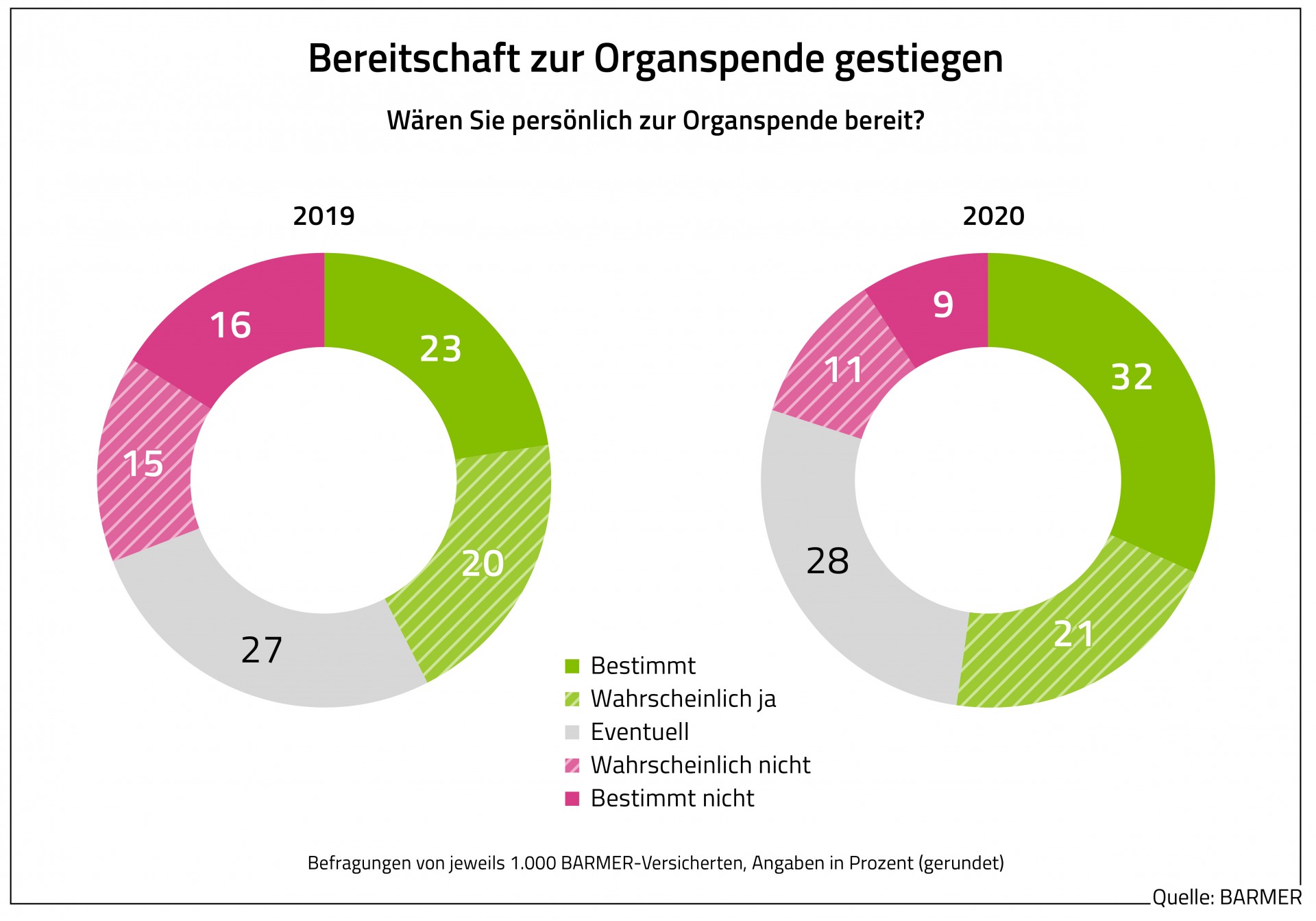 Deutlich mehr Menschen als im Vorjahr stehen einer Organspende positiv gegenüber. In einer repräsentativen Umfrage unter rund 1.000 Versicherten der BARMER im Mai dieses Jahres erklärten 32 Prozent der Befragten, dass sie bestimmt zur Organspende bereit sind. Ein Jahr zuvor waren es mit 23 Prozent deutlich weniger. Zugleich sank die Zahl derer, die eine Organspende bestimmt ausschließen, von 16 Prozent auf 9 Prozent. „Die Bewegung bei der Spendenbereitschaft ist ein positives Signal dafür, dass sich die Menschen sehr wohl mit diesem sensiblen Thema auseinandersetzen und eine Entscheidung treffen wollen“, so Prof. Dr. Christoph Straub, Vorstandsvorsitzender der BARMER.