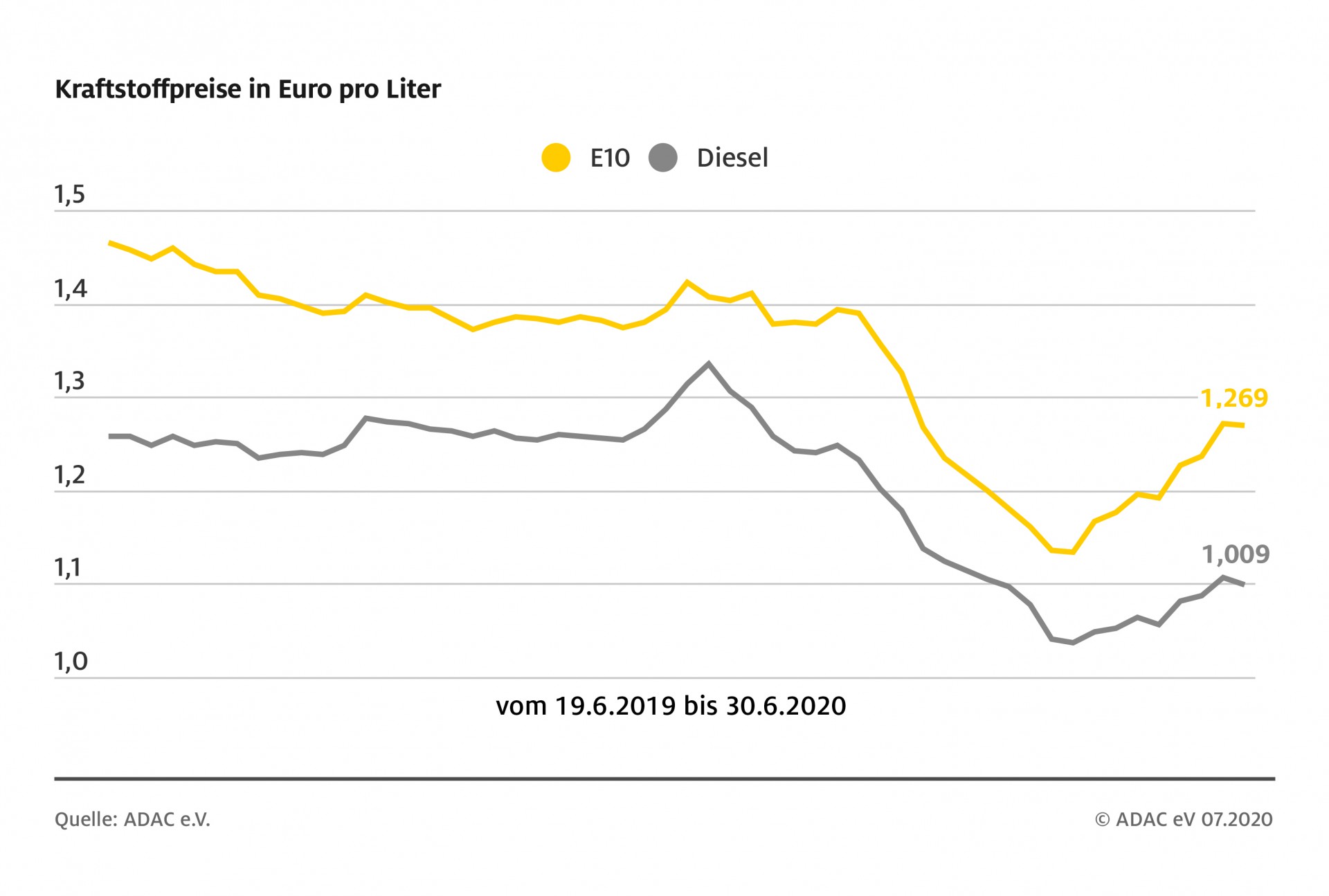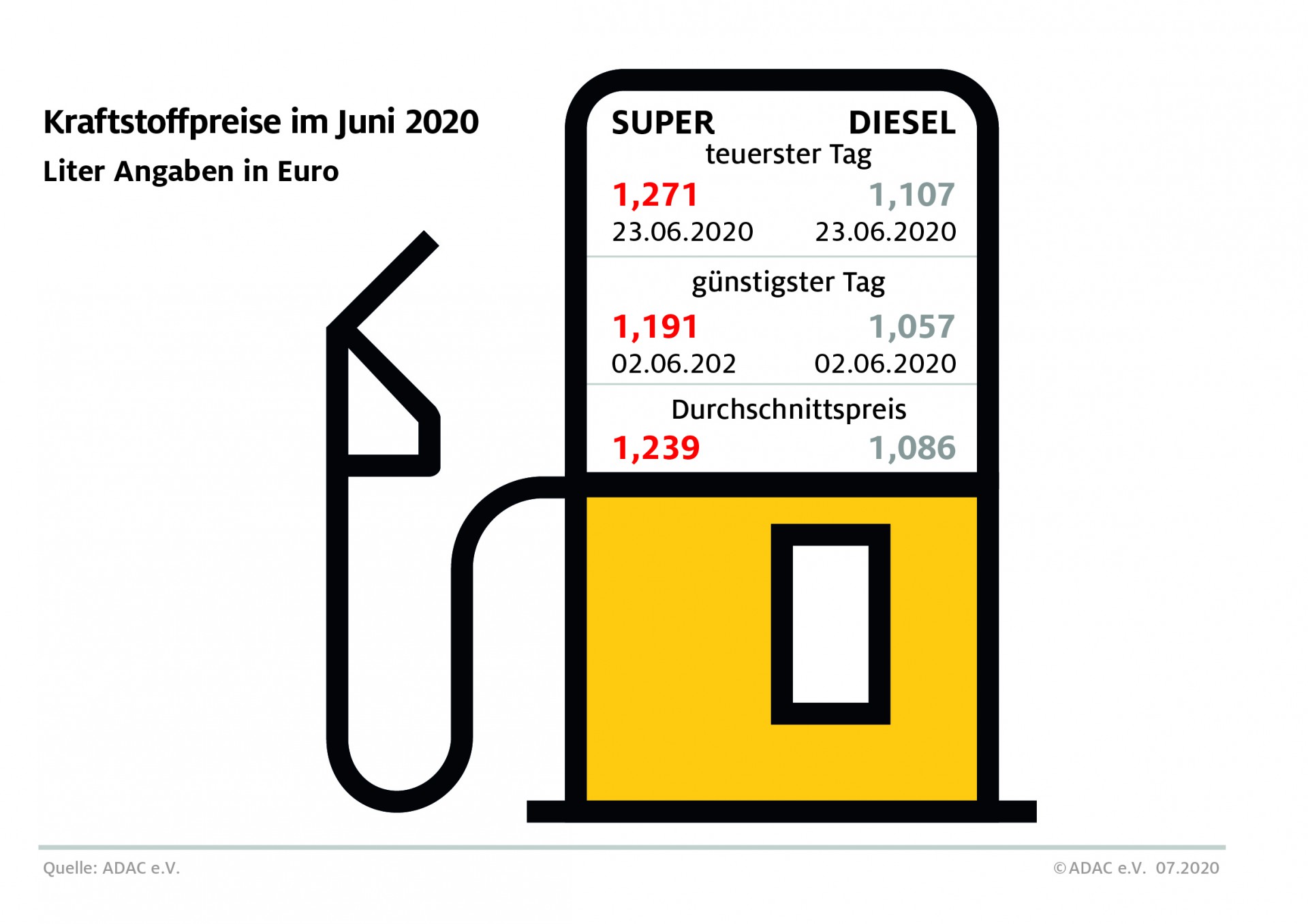 Nachdem die Kraftstoffpreise in Deutschland im Frühjahr zeitweise deutlich gesunken waren, haben sich die Preise im Juni wieder erhöht. Nach einer aktuellen Datenauswertung des ADAC lag der Durchschnittspreis für Super E10 im Juni bei 1,239 Euro je Liter und damit um 6,9 Cent über dem Vormonatswert. Diesel kostete im Schnitt 1,086 Euro je Liter, das war ein Plus gegenüber Mai von 3,6 Cent. Der Durchschnittspreis lag im Mai für Super E10 noch bei 1,170 Euro, der für Diesel bei 1,050 Euro.