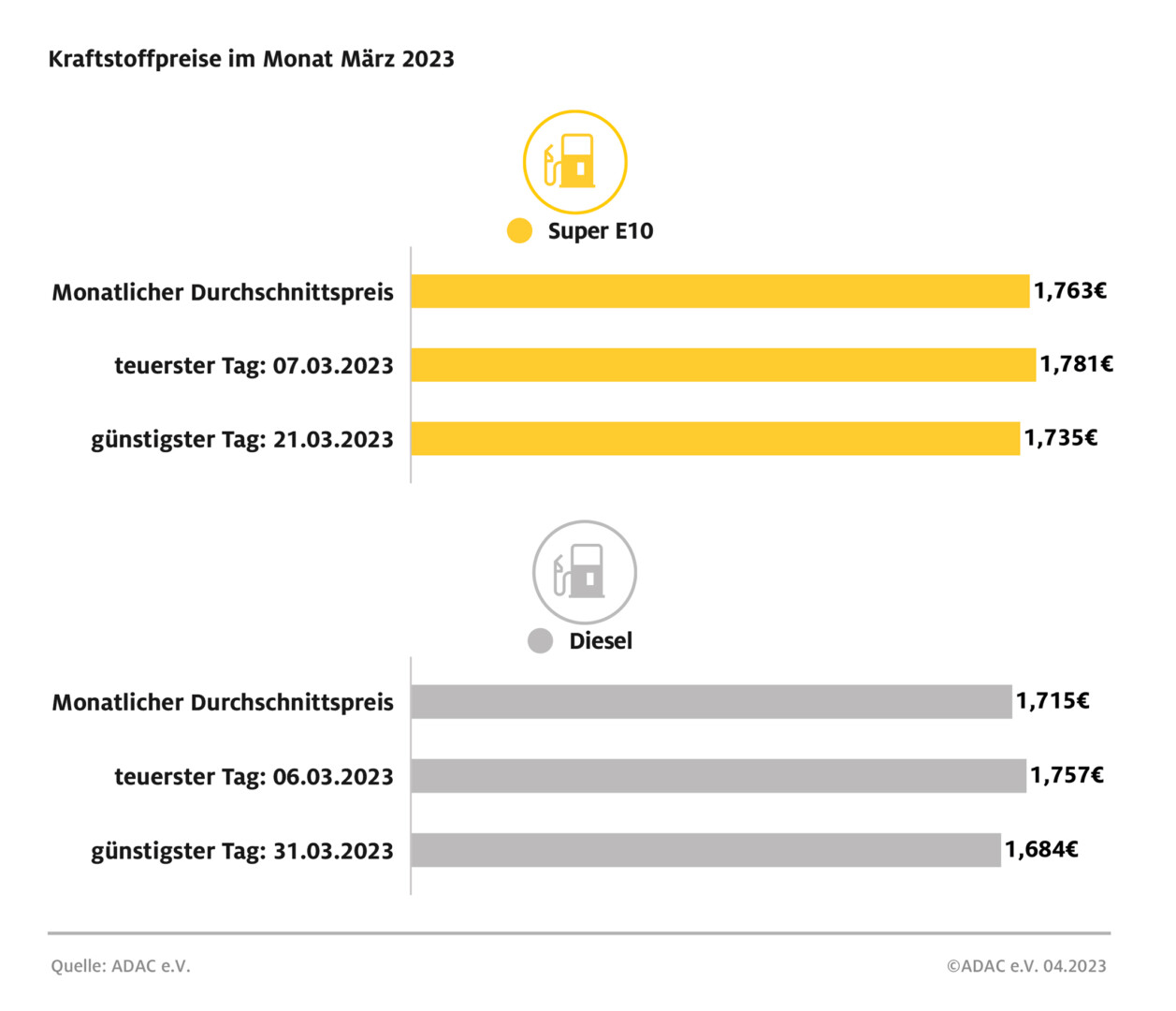 Teuerster Tanktag des Monats war bei Benzin der 7. März. Damals lag der Tagesdurchschnittspreis für einen Liter Super E10 bei 1,781 Euro. Am günstigsten war Super E10 am 21. März mit 1,735Euro. Dieselfahrer mussten am 6. März am meisten bezahlen: Ein Liter Diesel kostete 1,757 Euro. Am billigsten war Diesel am 31. März mit 1,684 Euro.