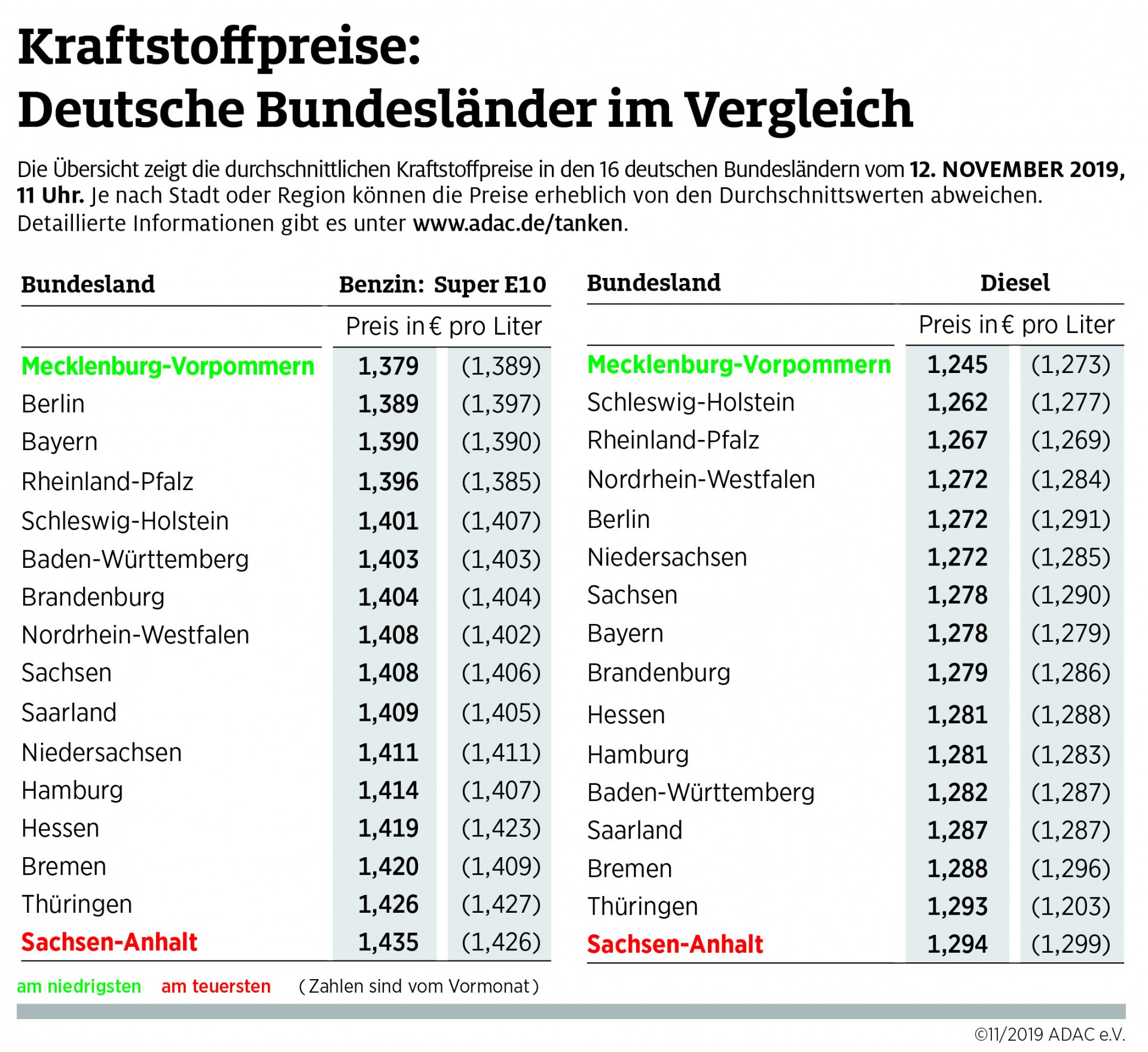 Das gleiche Bild zeigt sich bei Diesel: Ein Liter kostet in Mecklenburg-Vorpommern derzeit durchschnittlich 1,245 Euro und damit 4,9 Cent weniger als in Sachsen-Anhalt, das mit 1,294 Euro auch hier Schlusslicht ist.