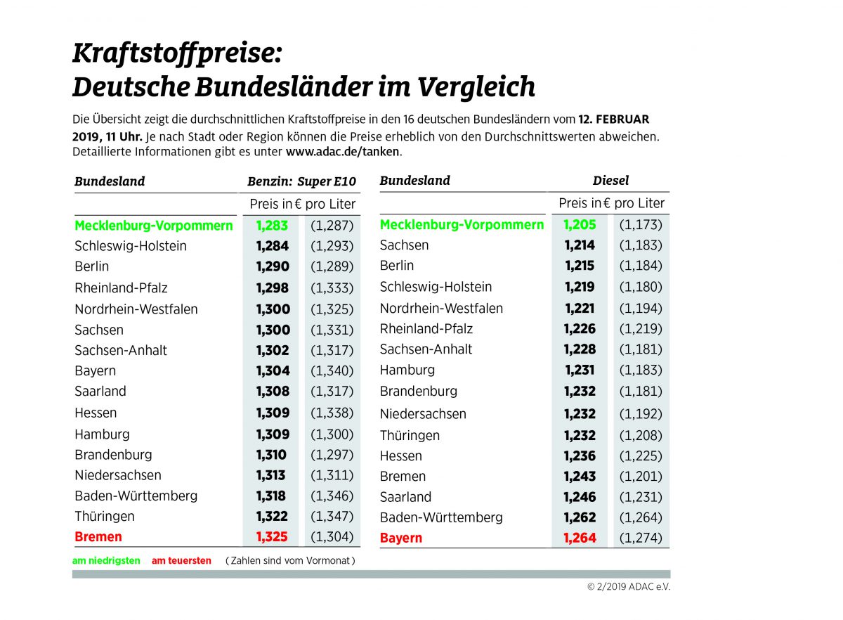 Die Preisunterschiede zwischen den Bundesländern haben sich gegenüber den Vormonaten aber deutlich verringert. Im Januar lag die Spanne zwischen teuerstem und billigstem Bundesland noch bei 6,0 Cent (Super E10) beziehungsweise 10,1 Cent (Diesel). Im Dezember betrug die Differenz bei Benzin sogar 14,9 und bei Diesel 14,6 Cent.