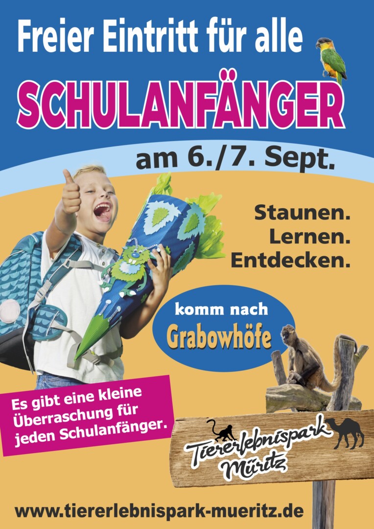 Auch, wenn es der eine oder andere vielleicht gar nicht hören mag – die Sommerferien in Mecklenburg-Vorpommern neigen sich dem Ende entgegen. Die kleinen ABC-Schützen sind sicher schon ganz aufgeregt. Wie schon in den Vorjahren, will der Tiererlebnispark Grabowhöfe den Schulanfängern eine Freude machen – sie haben am kommenden Sonnabend und Sonntag, 6. und 7. September, freien Eintritt. Außerdem wartet auf die ABC-Schützen eine kleine Überraschung.