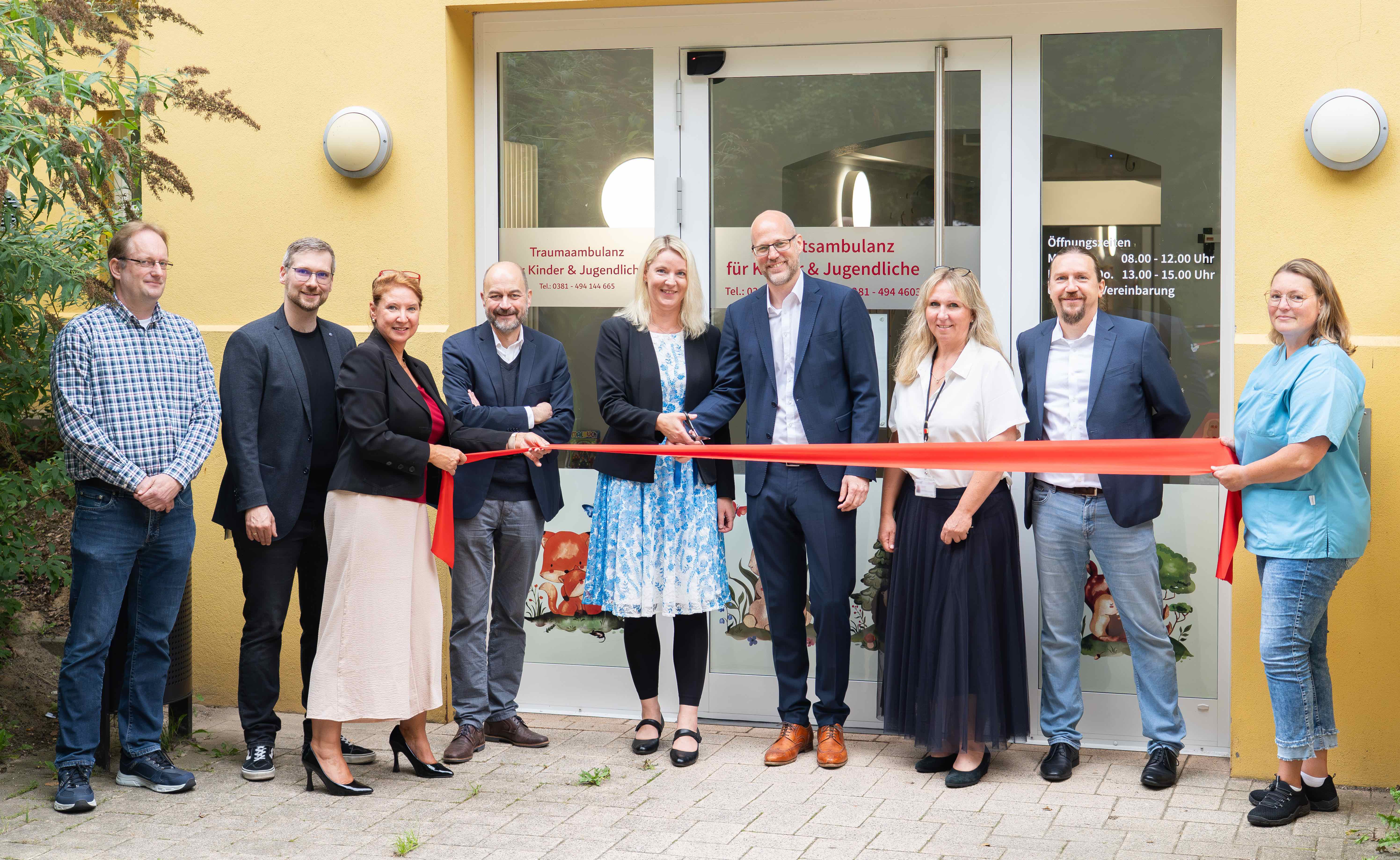 Bild: Eröffneten heute die Traumaambulanz der Unimedizin Rostock: v. l. Malte Raether (LAGuS), Dr. Martin Reinhardt (Leitender Oberarzt), Dr. Katja Wunsch (Leitende Psychologin), Prof. Dr. Michael Kölch (Klinikleiter), Anne Streubel (LAGuS), Carsten Krüger (Kaufmännischer Zentrumsleiter), Katja Gräfe (Pflegedienstleitung), André Seifert (LAGuS) und Schwester Kristin Brüggmann.