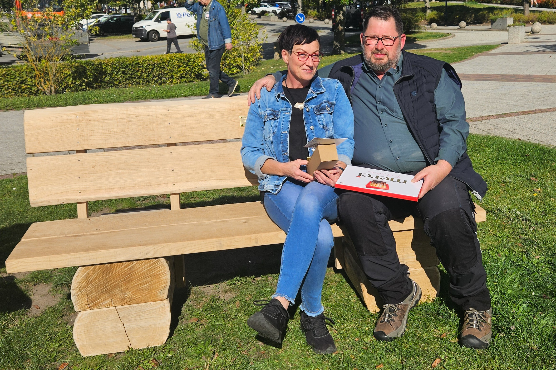 Bild unten: Mathias Meschede übergab die Bänke gemeinsam mit seiner Frau Sina. Das DBK bedankte sich mit einem kleinen Geschenk für das große.