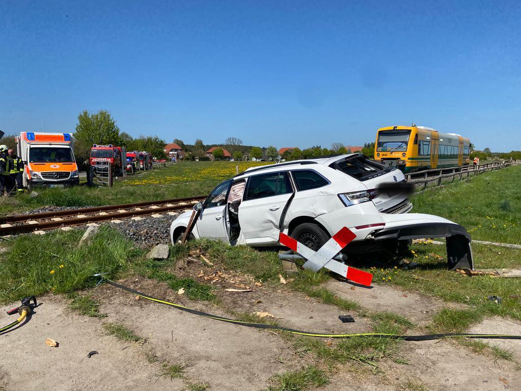 An einem unbeschrankten Bahnübergang zwischen dem Dorf Silz und dem Heidepark sind heute Nachmittag ein Triebwagen der ODEG und ein Auto zusammengestoßen. Dabei erlitt der 34 Jahre alte Autofahrer schwere, aber keine lebensbedrohlichen Verletzungen. Den entstandenen Schaden beziffert die Polizei auf rund 50 000 Euro, die Fahrgäste im Zug blieben unverletzt. Im Einsatz waren auch mehrere Feuerwehren der Region