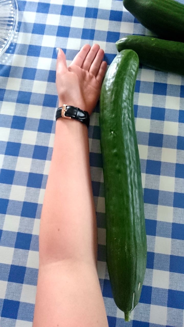 Hier ein Bild von Sophias Gurke, geerntet in Malchow und einer fast 3000 Gramm schweren Zucchini, die in einem Dorf bei Waren gewachsen ist.