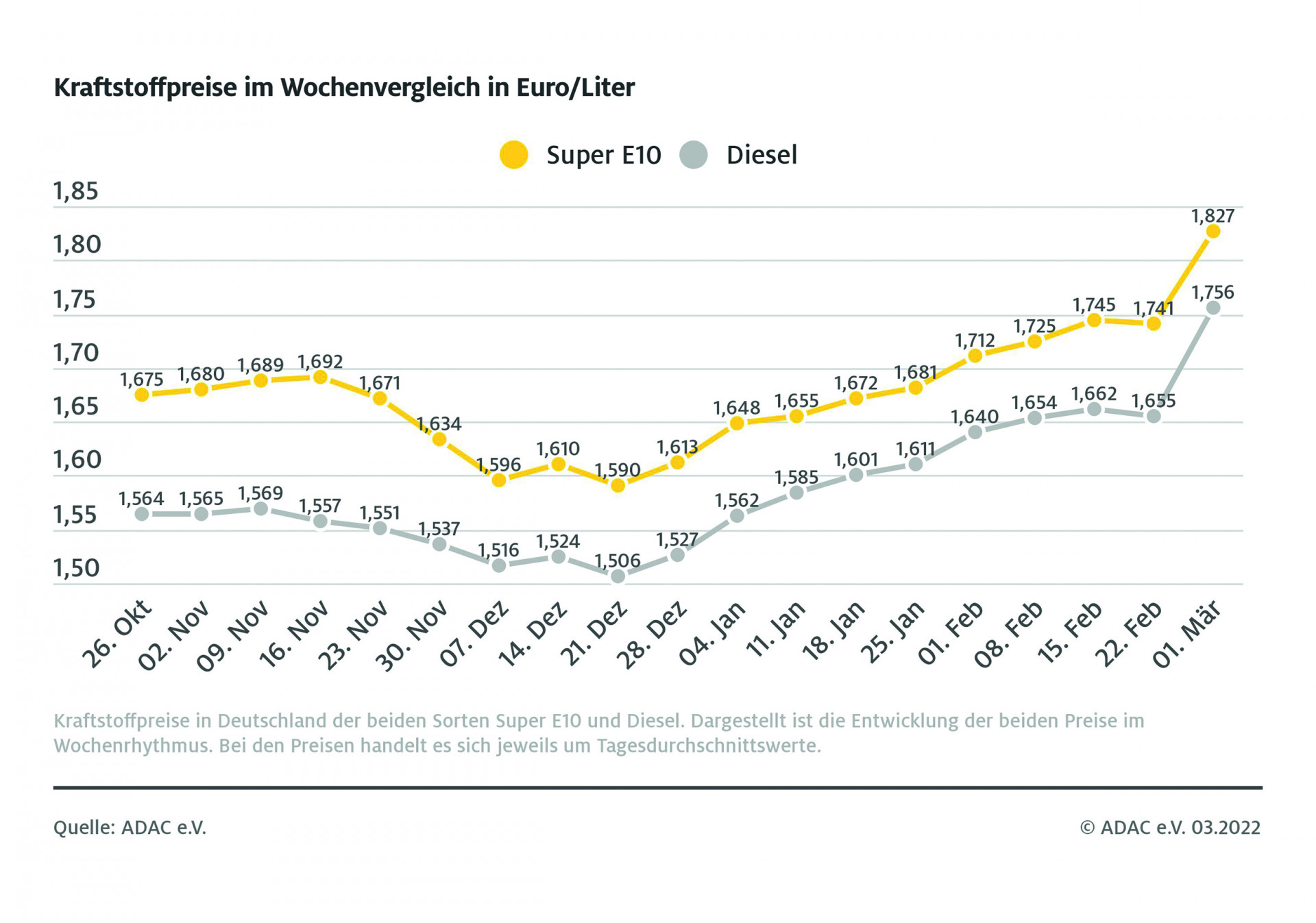 Der Anstieg der Kraftstoffpreise setzt sich weiter fort. Vor dem Hintergrund des Krieges in der Ukraine und der wachsenden Nervosität am Rohölmarkt kommt es zu neuen Höchstständen an den Zapfsäulen. In seiner wöchentlichen Auswertung der Spritpreise ermittelt der ADAC bei beiden Kraftstoffen einen enormen Preissprung im Vergleich zur Vorwoche. So kostet ein Liter Super E10 im bundesweiten Mittel 1,827 Euro. Das entspricht einem Anstieg von 8,6 Cent im Vergleich zur vergangenen Woche. Noch größer fällt die Wochendifferenz beim Diesel aus: Mit einem Preis von 1,756 Euro kostet ein Liter hier im Bundesschnitt 10,1 Cent mehr.