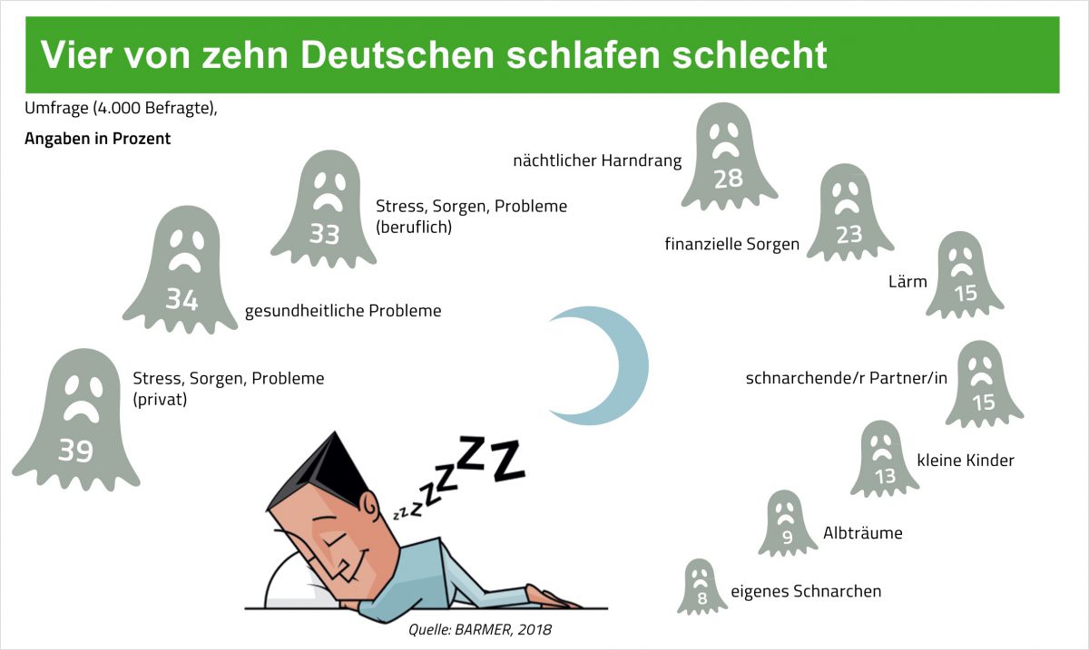 Am kommenden Wochenende werden die Uhren wieder auf Sommerzeit umgestellt. Viele Menschen werden dann ein paar Tage brauchen, bis ihr Bio-Rhythmus sich darauf eingestellt hat. Laut einer aktuellen BARMER-Umfrage stören aber auch andere Faktoren einen guten Schlaf. Als Hauptursache geben vier von zehn Deutschen private Sorgen und Probleme an. 34 Prozent nennen gesundheitliche Probleme und jedem Dritten raubt beruflicher Stress den Schlaf.