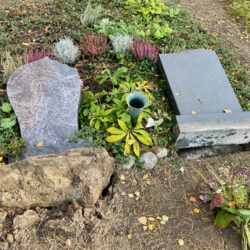Was die Täter sicher am meisten ärgert: Die Toten kümmert das nicht die Bohne, denen ist es wurscht. Ich selbst habe für meine Lieben einen liegenden Stein gewählt. Was schon liegt, kann nicht fallen. Überdies hat man seine Angehörigen im Herzen.