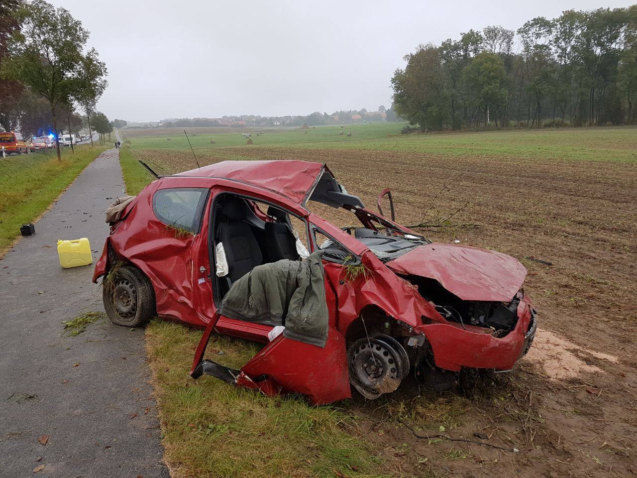 Wie es auf Nachfrage heißt, kam der junge Mann von der Straße ab und fuhr auf einen Regendurchlass. Der Wagen wurde hoch geschleudert, hat sich in der Luft gedreht, kam auf der Erde auf und wurde wieder hochgeschleudert.