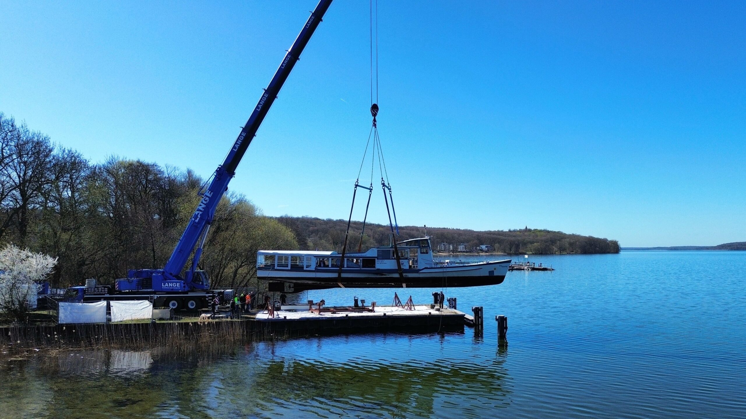 Die „Uns Fritzing“ am Haken – das sieht man am Tollensesee nur alle fünf Jahre. Jetzt war es wieder soweit: Zur großen „Konservierung“ wurde das 23 Tonnen schwere neu.sw Linienschiff per Kran aufs Trockene gehoben. Der Rumpf wird nun von Algenbewuchs und Muscheln befreit und auf Schäden und Roststellen untersucht. Anschließend bekommt das Schiff einen neuen Anstrich, um es auch die kommenden Jahre vor Fäulnis, Rost und erneutem Bewuchs zu schützen.
