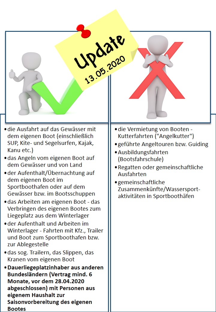 Dauerliegeplatzinhaber aus anderen Bundesländern können ihren Liegeplatz nebst Boot wieder nutzen, wenn sie einen Vertrag über mindestens sechs Monate für das Jahr 2020 vor dem 28.04.2020 abgeschlossen haben. Dazu gehört auch das Verbringen des Bootes aus dem Winterlager an den Sommerliegeplatz, sowie die Vorbereitung des Bootes auf das Einsetzen in das Wasser. Sie dürfen sich dabei von Personen aus dem eigenen Haushalt begleiten lassen.