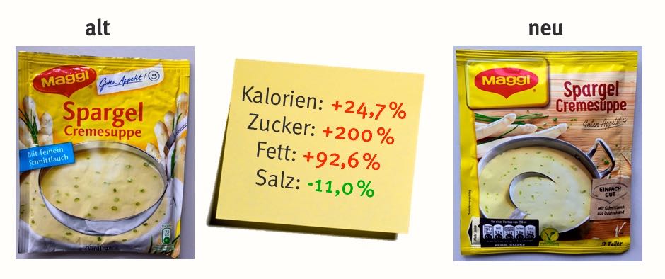 Nur bei 13 Prozent (3 von 24) der geprüften Lebensmittel, den Cerealien »Nesquik Duo« und »Clusters Mandel« sowie der »Maggi Tierfigurensuppe«, sank der Fettgehalt um über 10 Prozent in den letzten neun Jahren. Viele andere Produkte wie die »Maggi Spargelcremesuppe Guten Appetit«, die aktuell mit fast doppelt so viel Fett ausgestattet ist wie im Jahr 2015, machen keine gute Figur. Solche Fertiglebensmittel in der Stichprobe sorgen dafür, dass die Verbraucherschützer insgesamt keine Fettreduktion feststellen konnten.